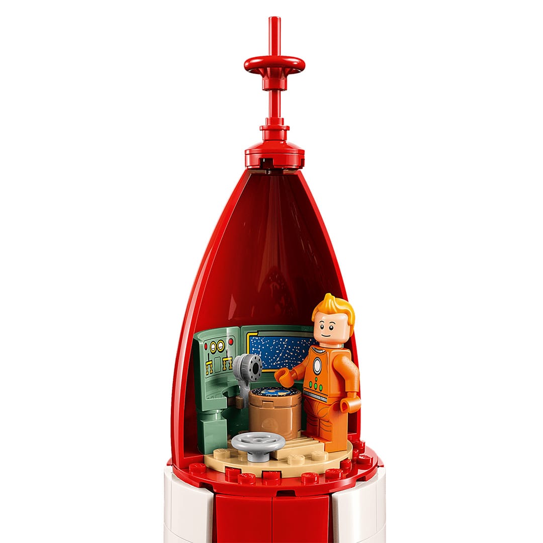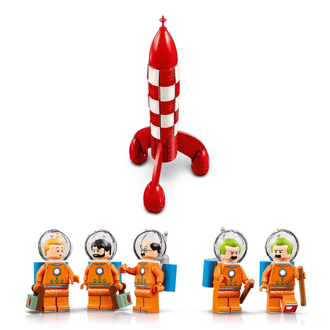 • Fidèle aux albums Objectif Lune et On a marché sur la Lune, le modèle inclut six minifigurines emblématiques : Tintin, Haddock, Tournesol, Dupond, Dupont et Milou en combinaison spatiale.