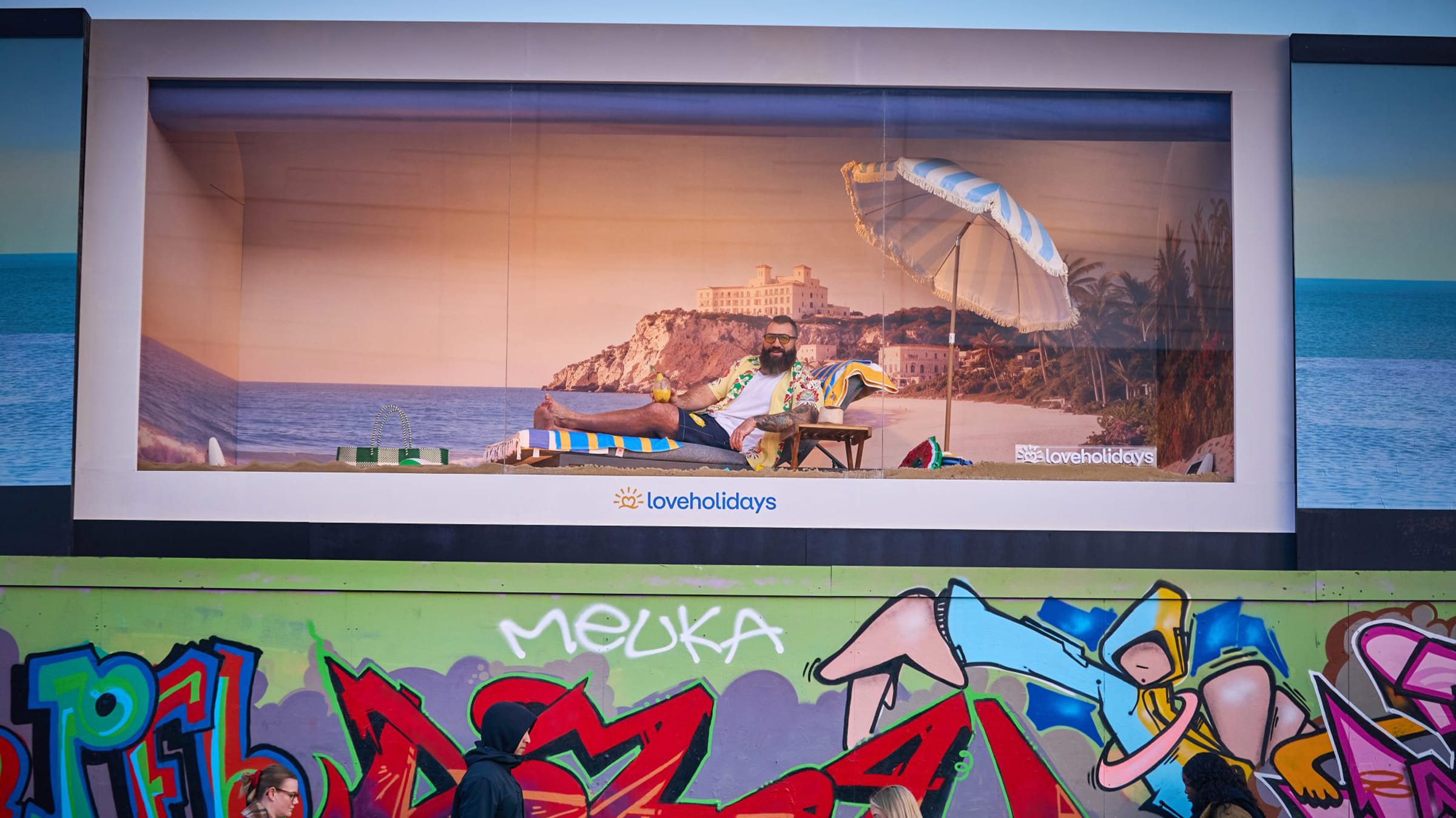 - À Shoreditch, Loveholidays transforme un billboard en véritable plage habitée pendant cinq jours : un acteur bronzant derrière une vitre, sous un soleil artificiel, déclenchant une vague virale sur TikTok avec 1,8 million de vues en 24 h.