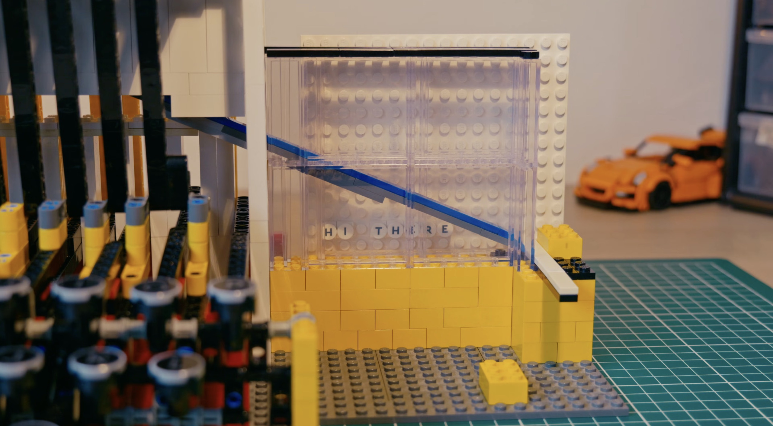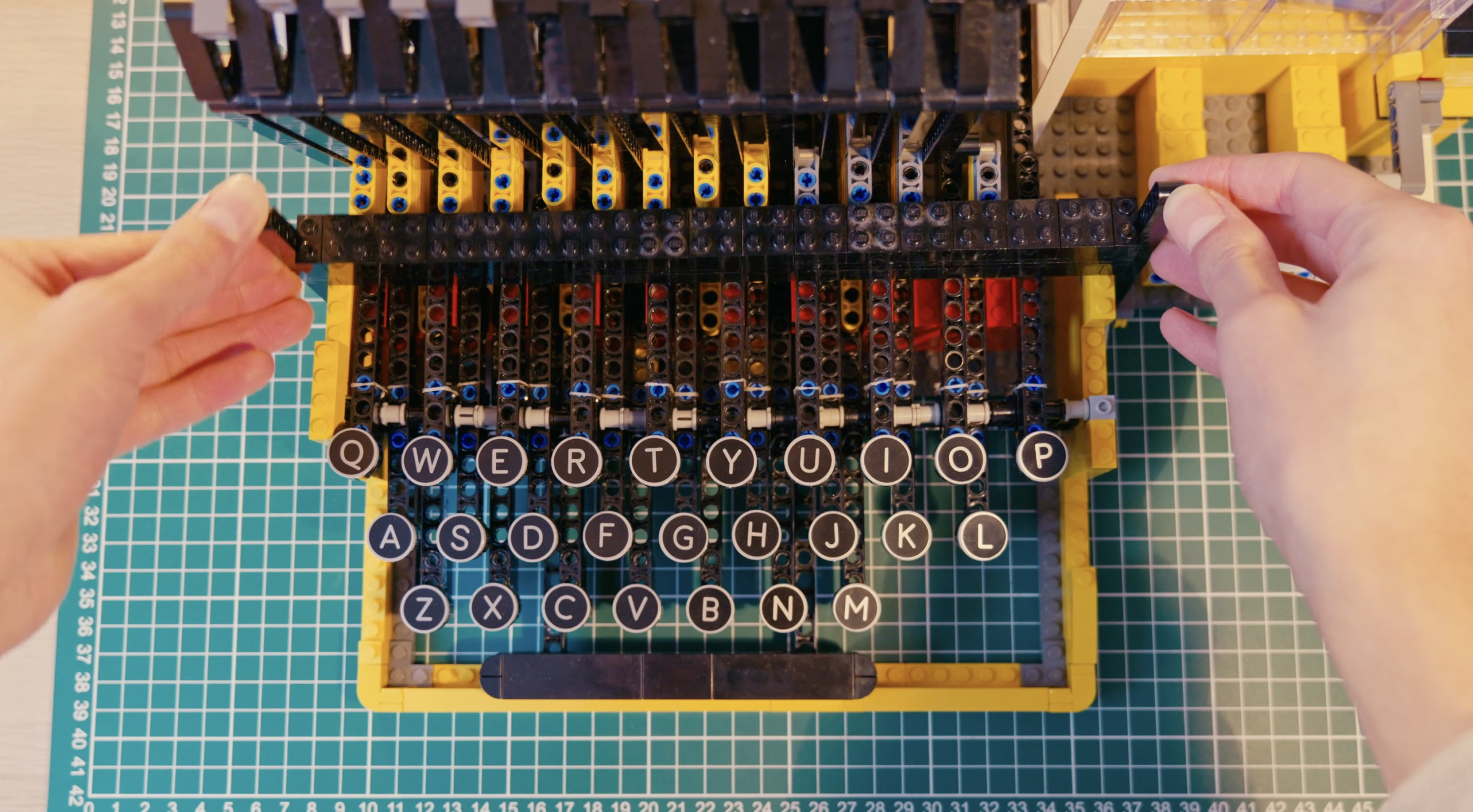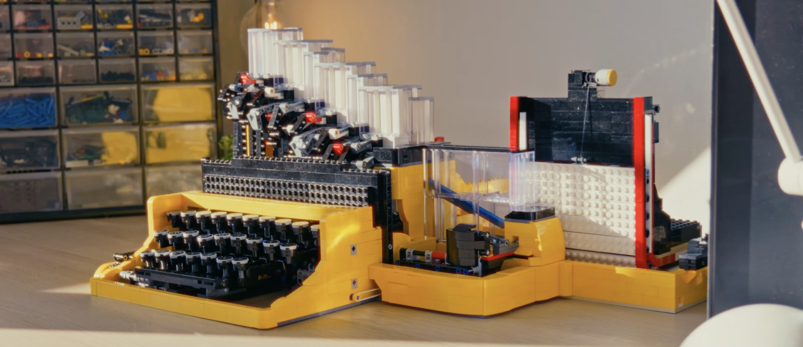 Chaque touche déclenche un mécanisme ingénieux. En appuyant sur une lettre, un petit réservoir s’ouvre et libère une tuile LEGO marquée du caractère correspondant. La pièce glisse le long d’une rampe, puis est propulsée par un système proche d’un lanceur de flipper, avant de venir se fixer sur la surface blanche qui sert de feuille.