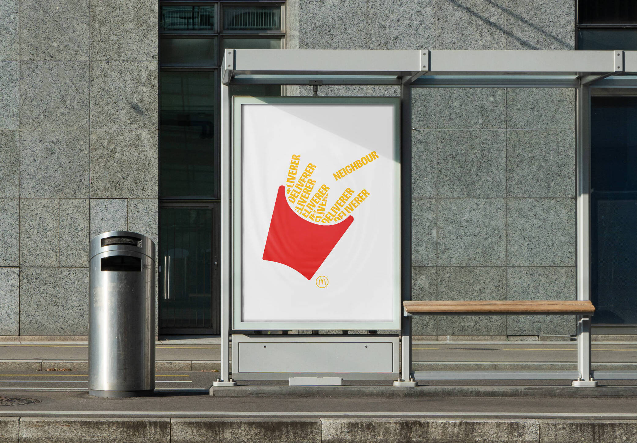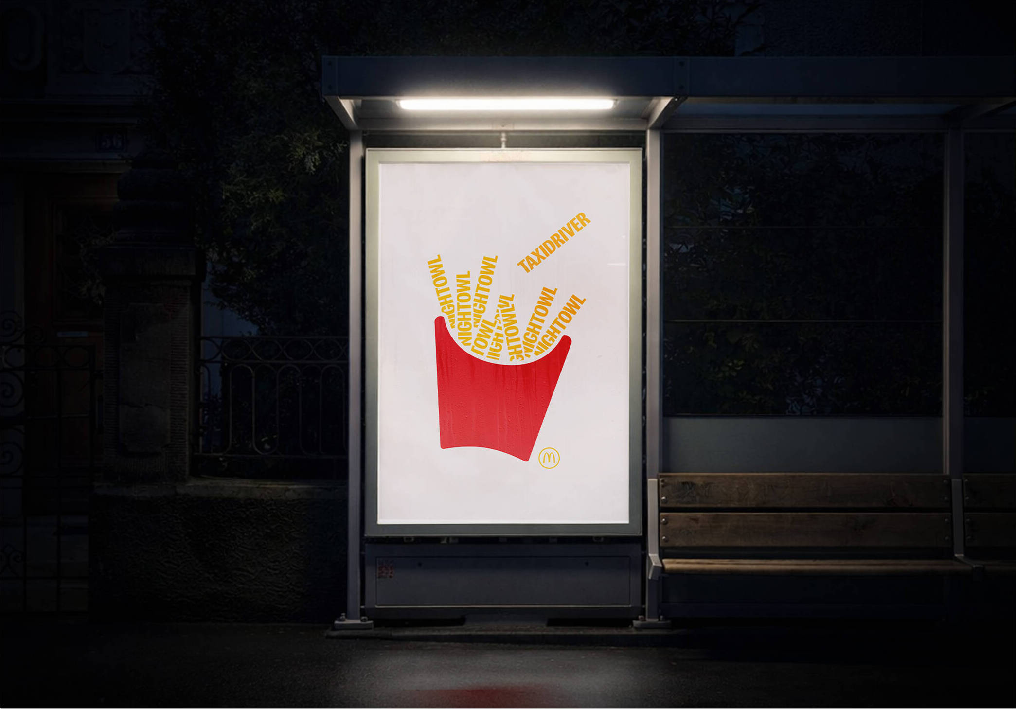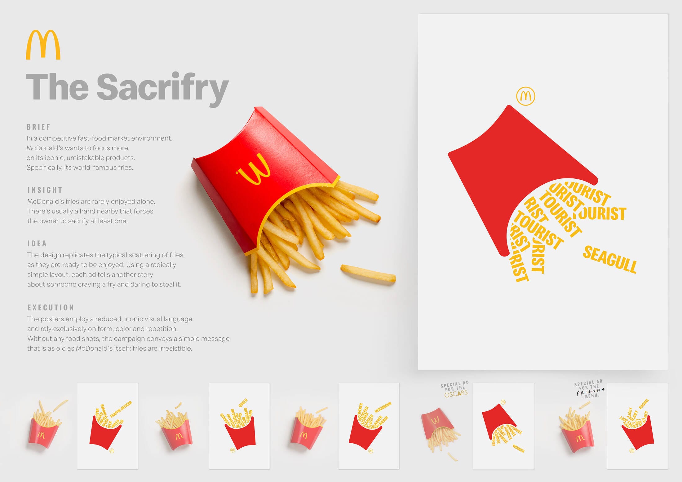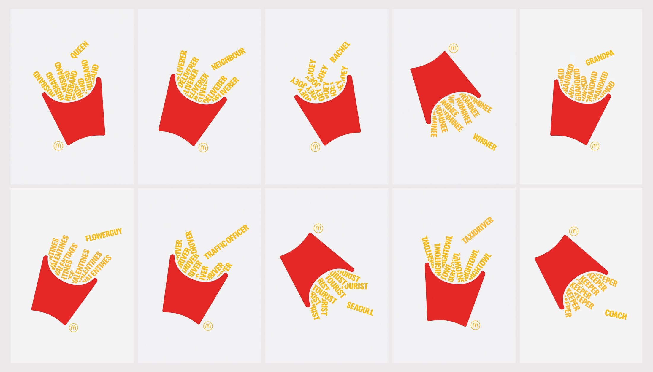 La force de la campagne repose sur sa simplicité. Les affiches utilisent uniquement les couleurs emblématiques de la marque, la répétition des formes et l’image iconique de la boîte de frites.