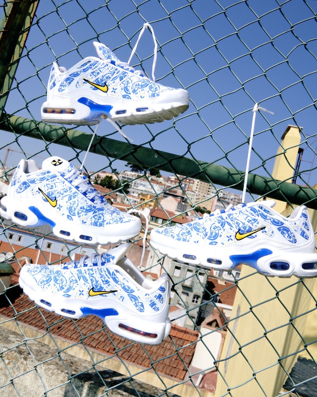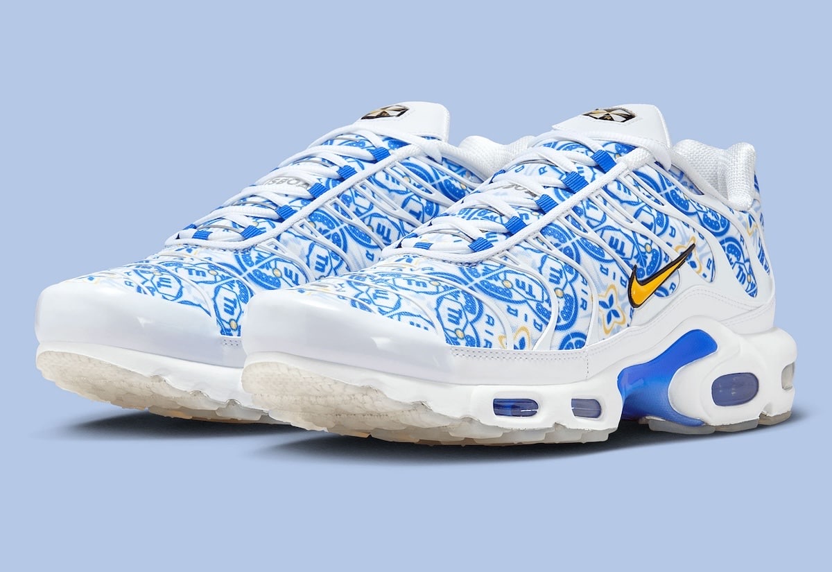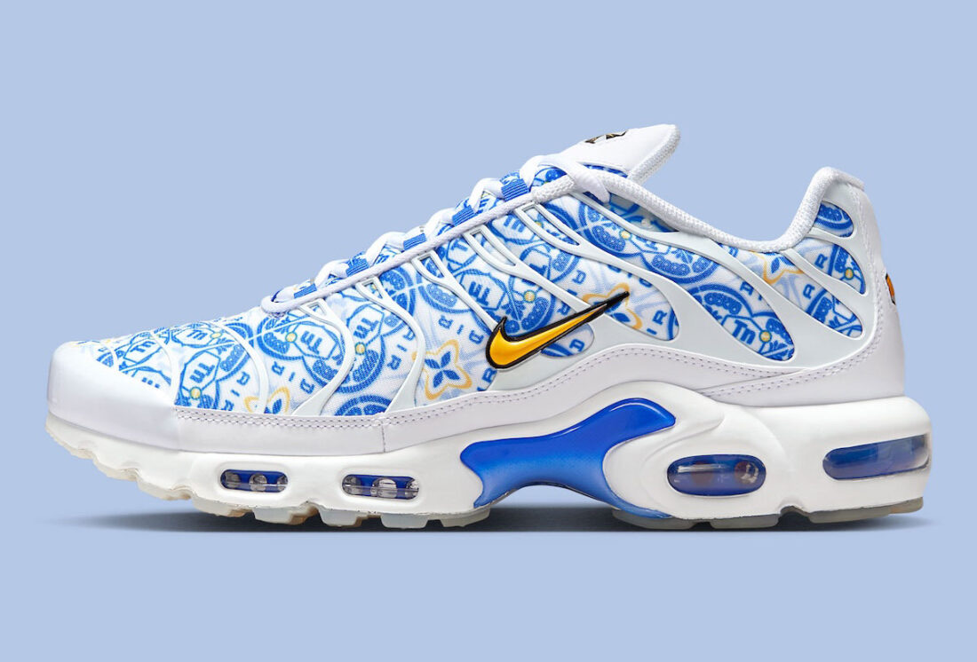 La silhouette emblématique de la Air Max Plus se pare ainsi d’un motif inspiré des carreaux traditionnels portugais, tandis que le Swoosh doré apporte une touche premium et que l’inscription “Lisbon” sur la languette revendique fièrement l’ancrage local. Même la semelle fait référence à l’architecture de la ville avec un graphisme rappelant la célèbre calçada portuguesa.