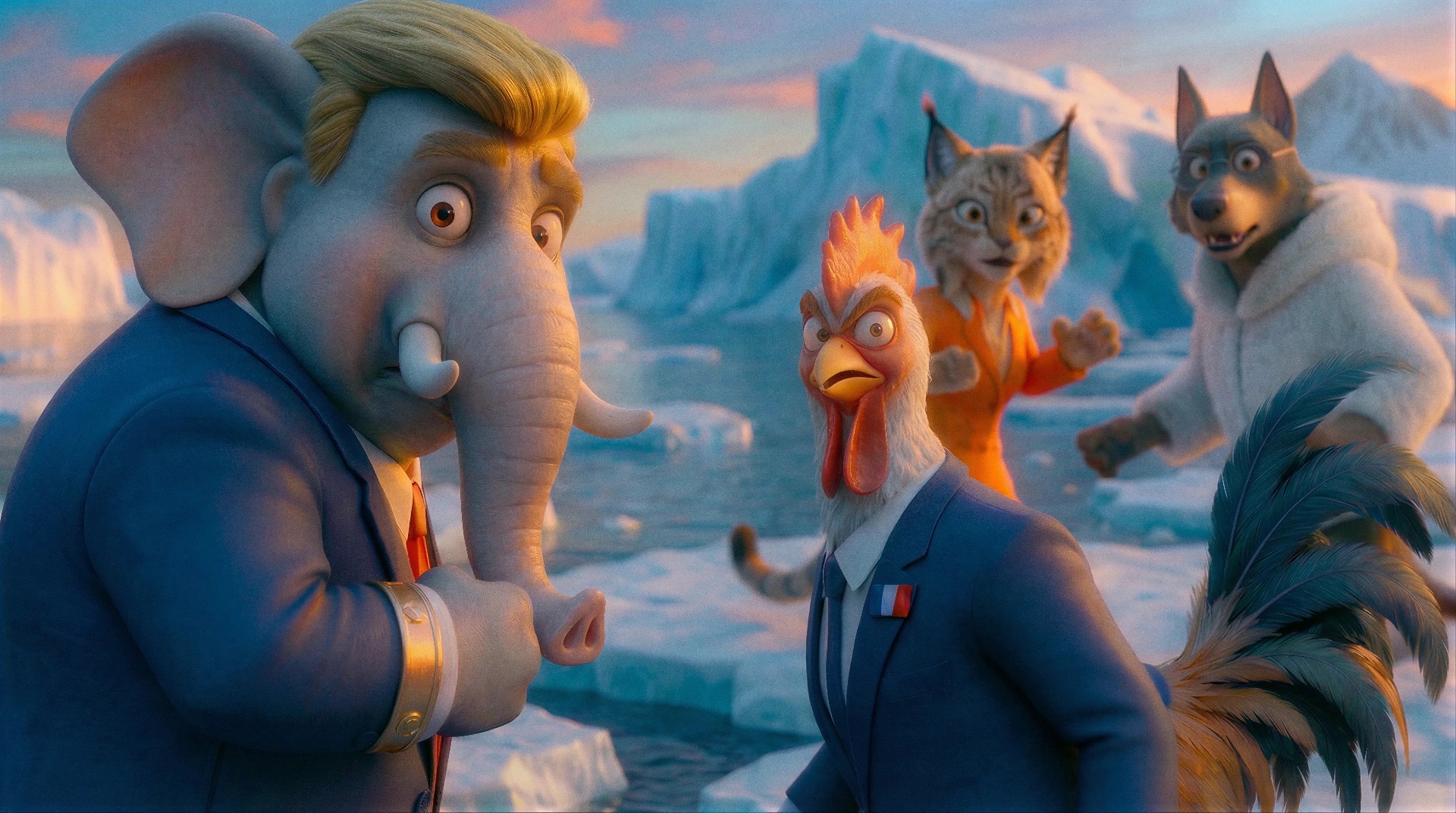 Mais cette douceur apparente masque une lecture bien plus acide. Chaque animal incarne une figure humaine identifiable : dirigeants, médias, scientifiques, industriels ou stratèges improvisés. Tous arrivent avec leur discours, leurs intérêts et leurs symboles, transformant l’écran en une scène de théâtre absurde où les postures prennent le pas sur la réalité.