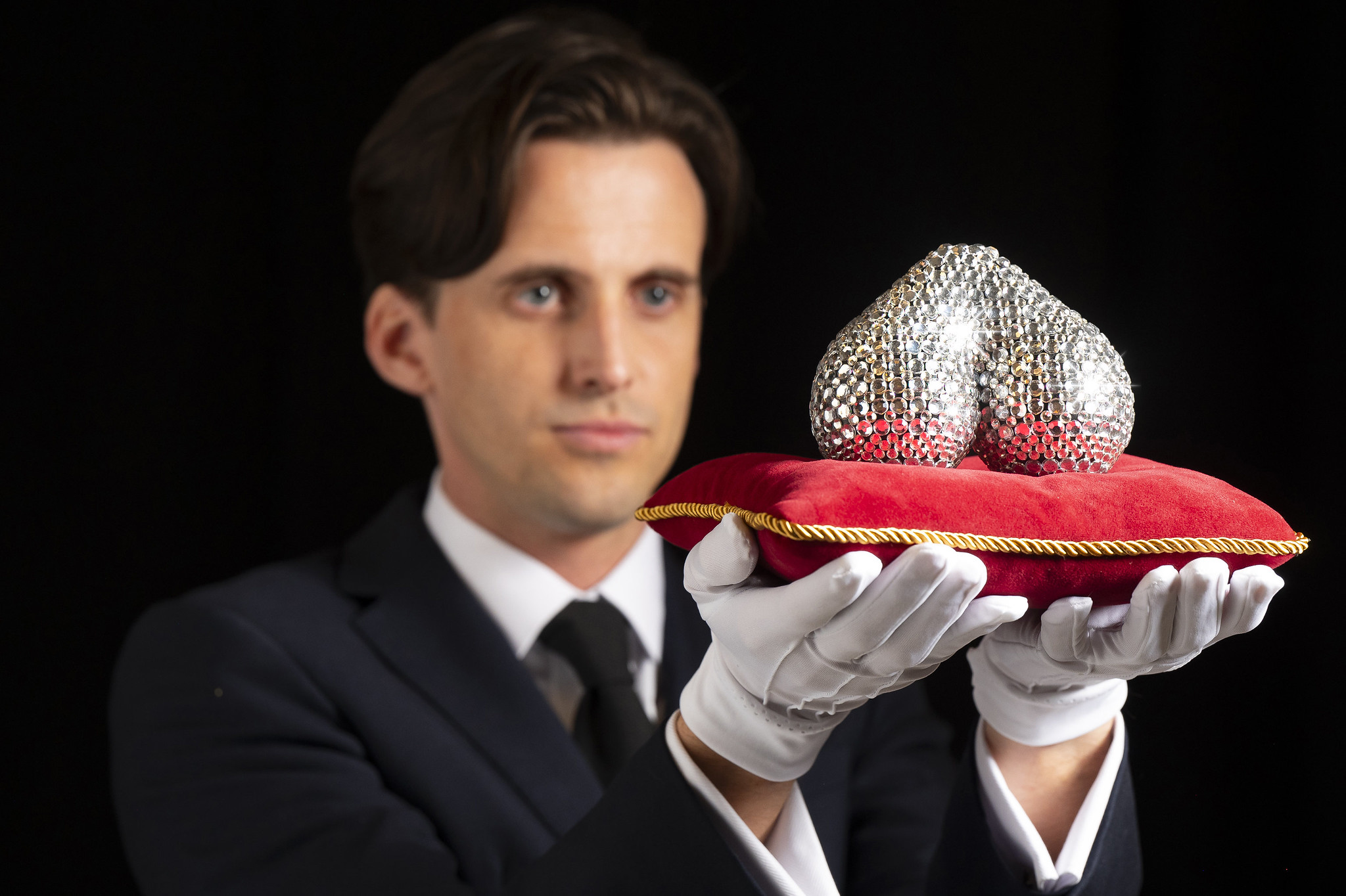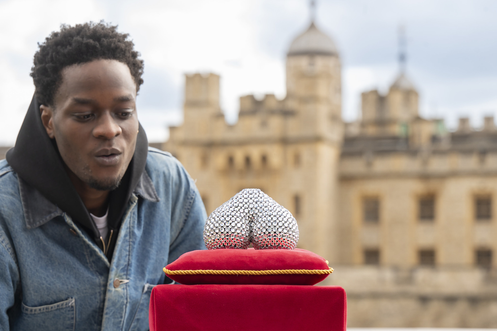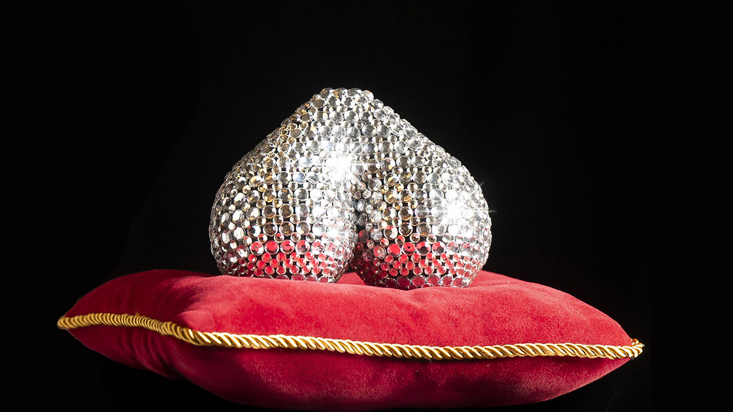 Au cœur du dispositif, une paire de “bijoux de famille” revisitée. Présentée comme un objet précieux dans une vitrine digne d’un musée, la sculpture reprend les codes des véritables joyaux royaux… mais avec un clin d’œil évident.