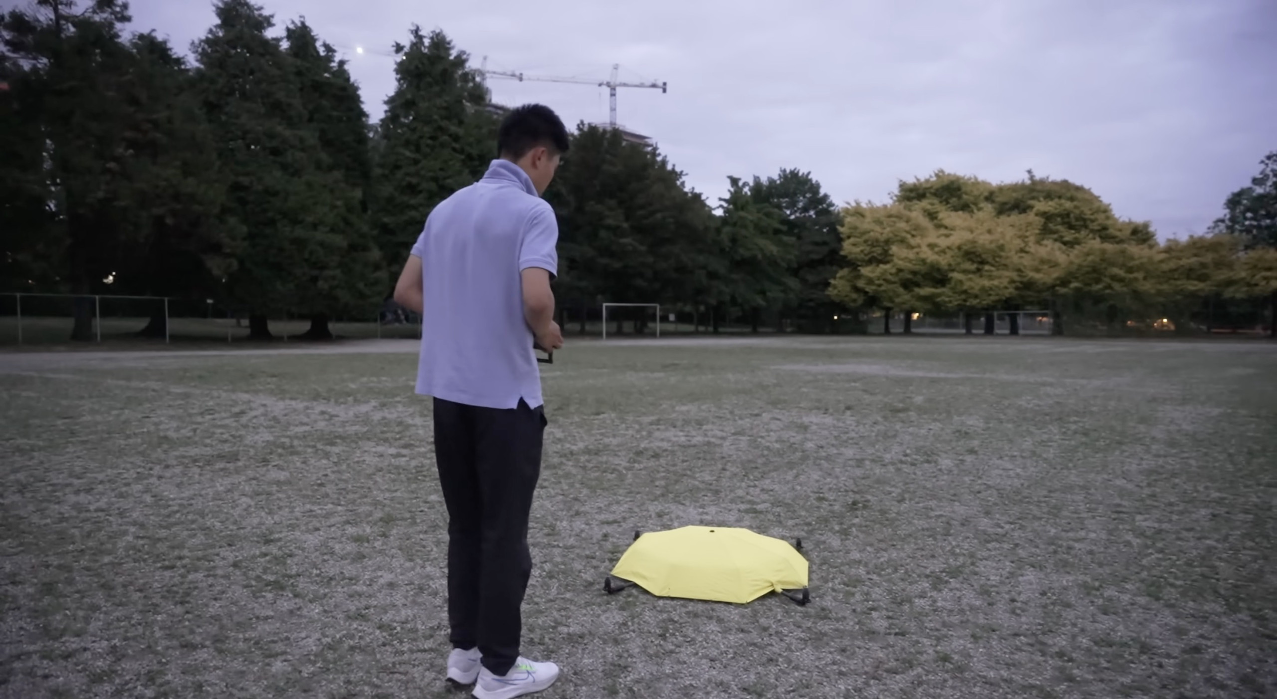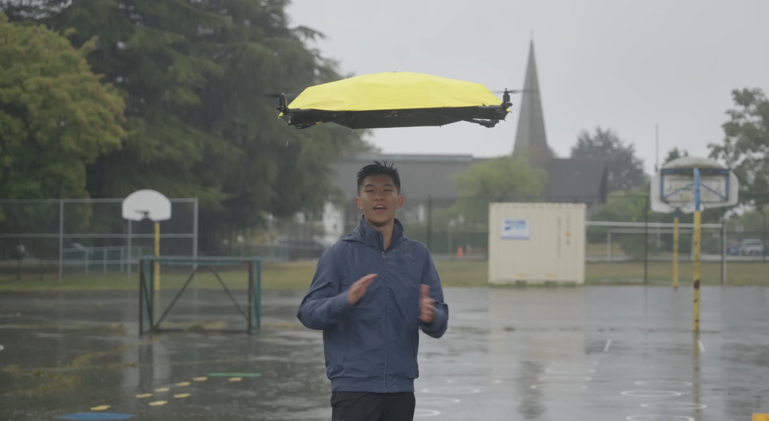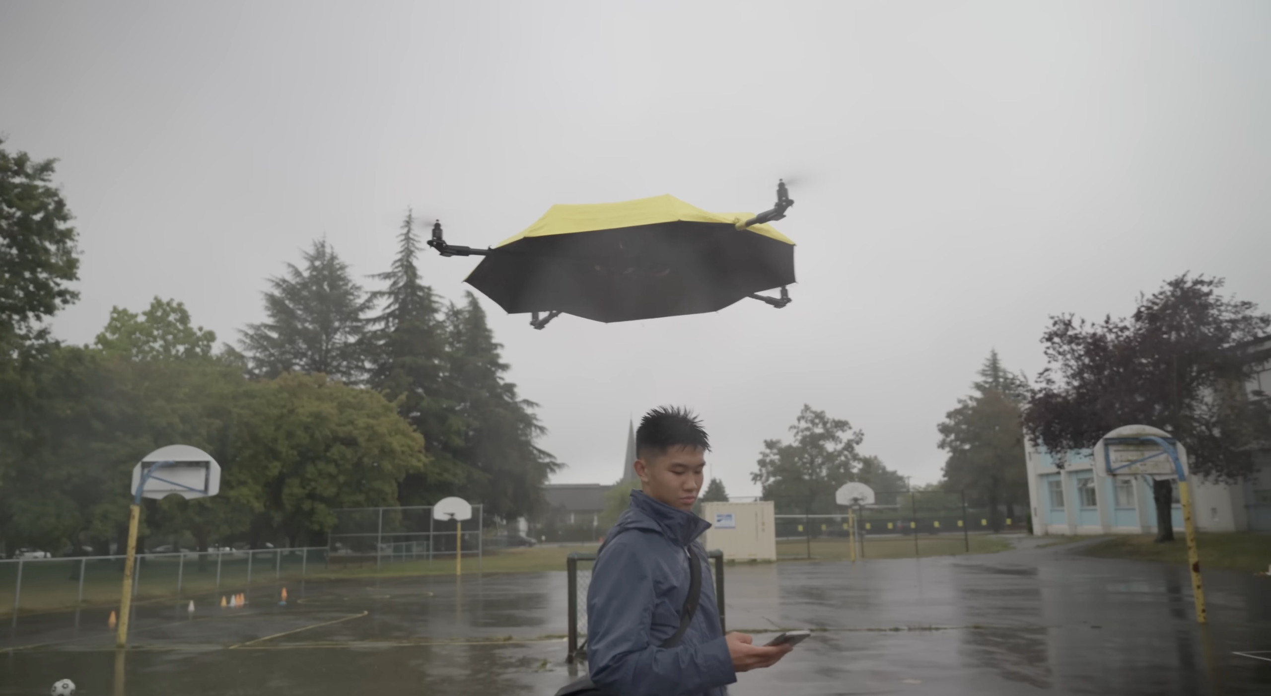 Sa réponse prend la forme d’un objet aussi improbable que fascinant. Un parapluie volant, autonome, capable de suivre son utilisateur et de le protéger de la pluie comme du soleil, sans aucune action de sa part. Un mélange de drone, d’objet du quotidien et de science-fiction bricolée avec beaucoup de rigueur.