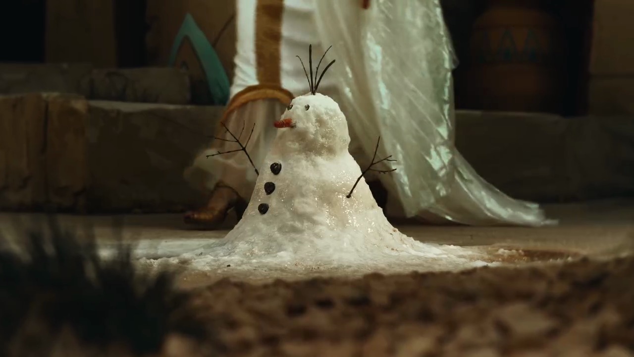 Plutôt que d’ignorer l’événement, le Parc Astérix s’en empare et le transforme en opportunité créative. La vidéo met en scène Cléopâtre dans un décor ensoleillé, croisant un bonhomme de neige en train de fondre. Difficile de ne pas y voir un clin d’œil direct à l’univers de La Reine des Neiges.