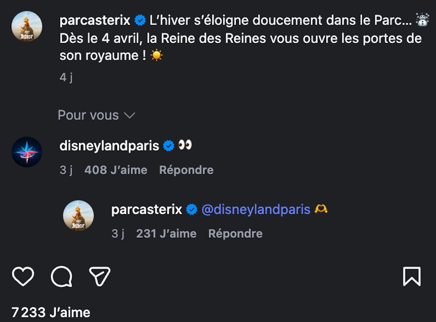 À l’occasion de l’ouverture de la zone dédiée à La Reine des Neiges, le parc gaulois a ainsi dégainé une vidéo maligne sur ses réseaux sociaux. Une prise de parole qui détourne l’actualité de son rival pour mieux mettre en avant ses propres nouveautés.