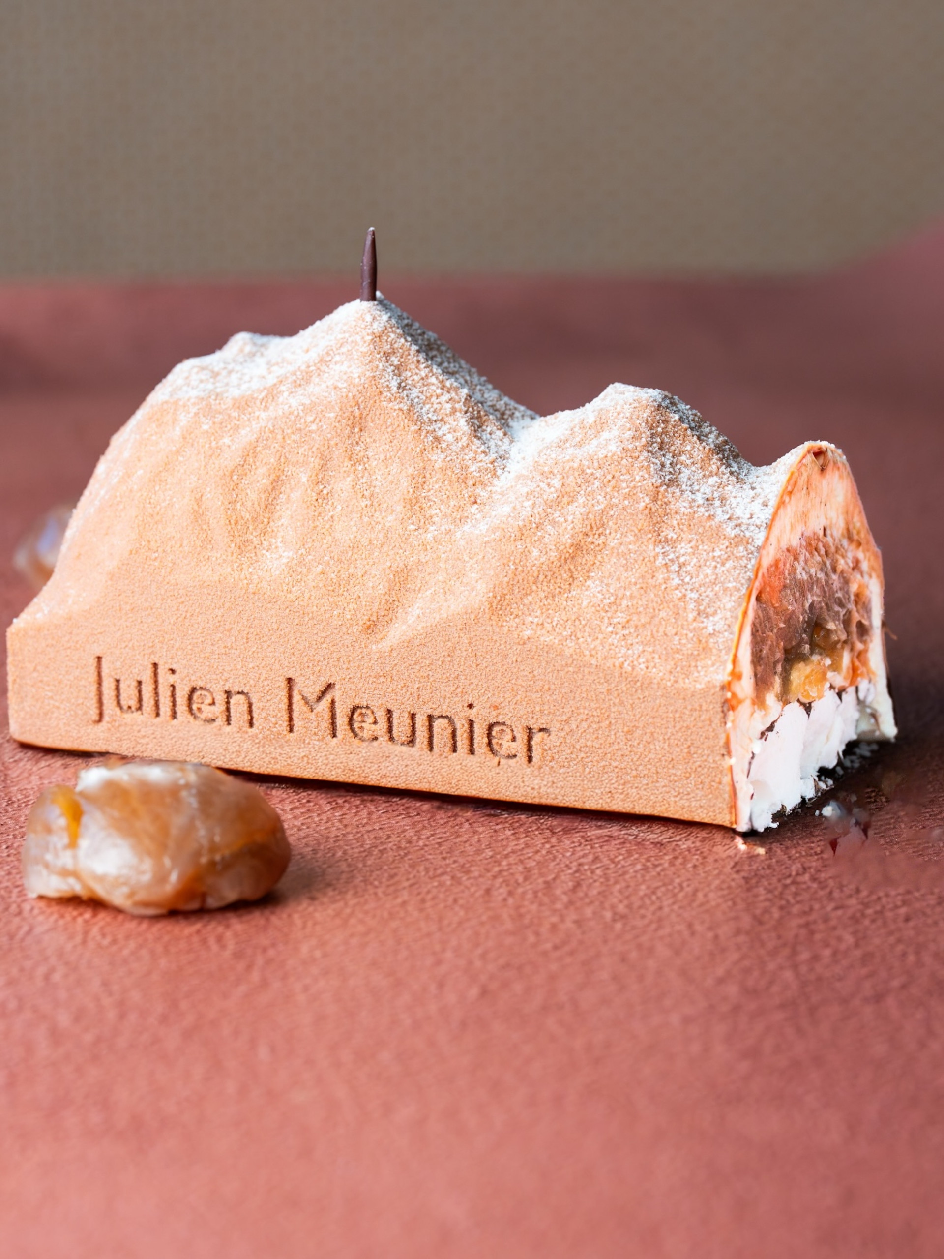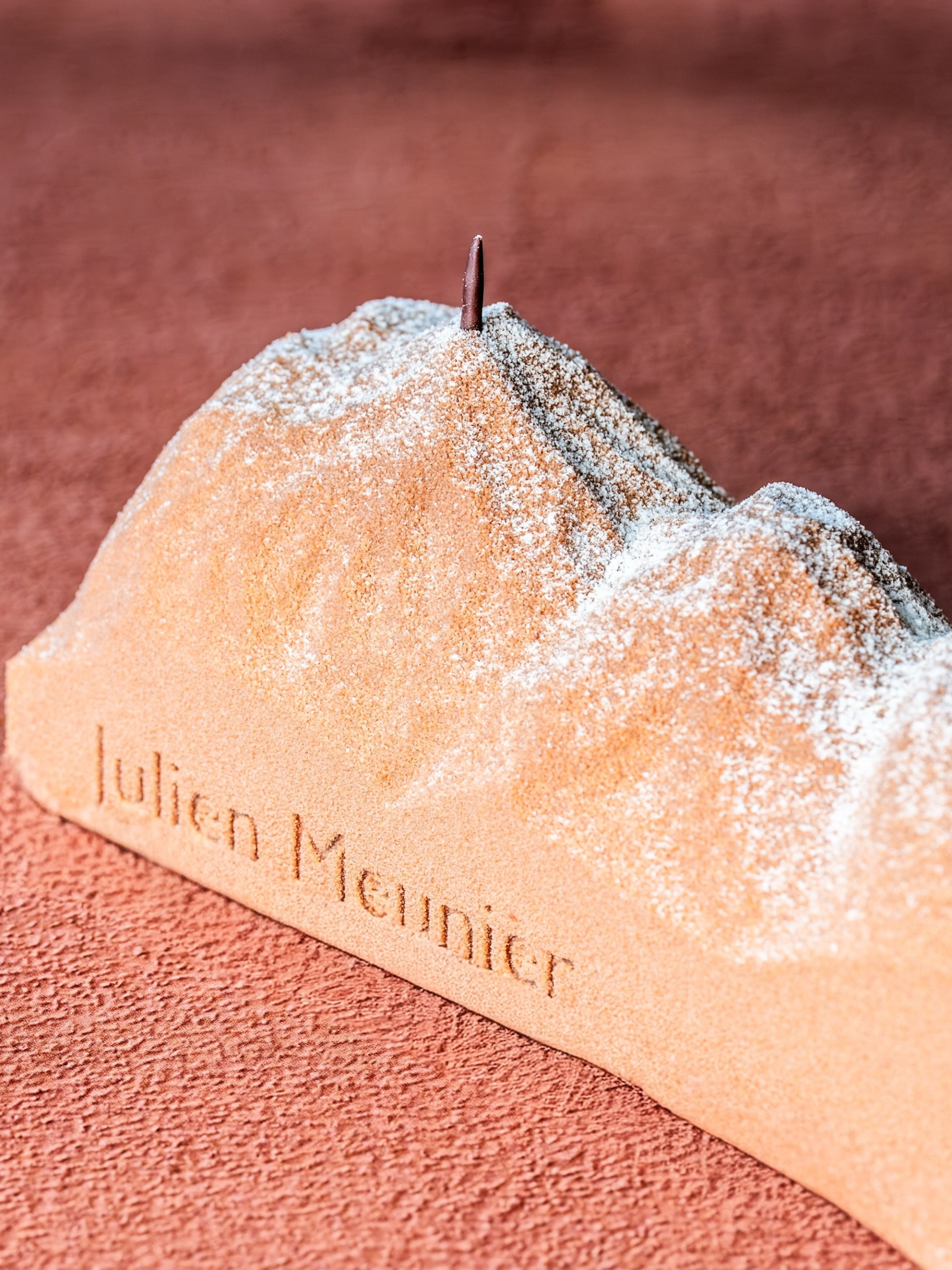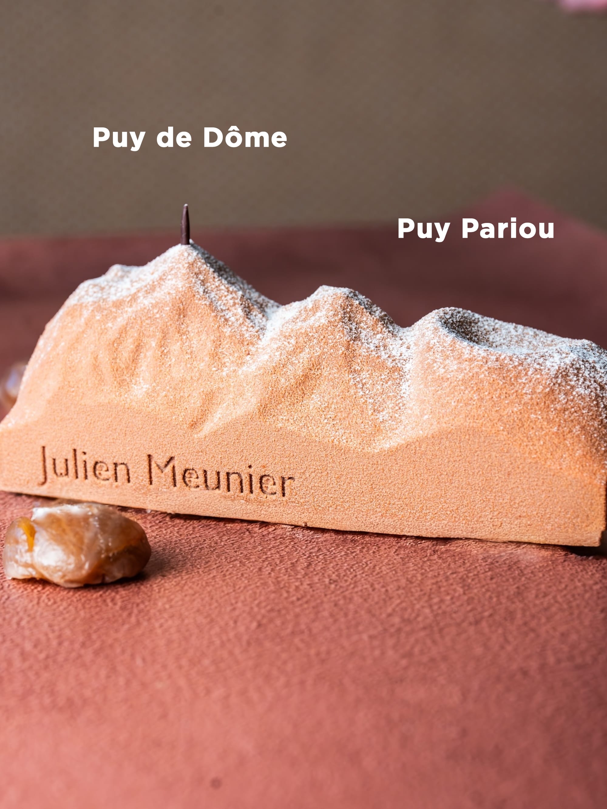 En parallèle de ses créations classiques, Julien Meunier dévoile cette année une pièce spectaculaire : la bûche Chaîne des Puys. Inspirée du Puy-de-Dôme et du Puy Pariou, elle reproduit fidèlement les reliefs volcaniques auvergnats grâce à un moule unique, développé après plus d’un an de recherches et d’essais.