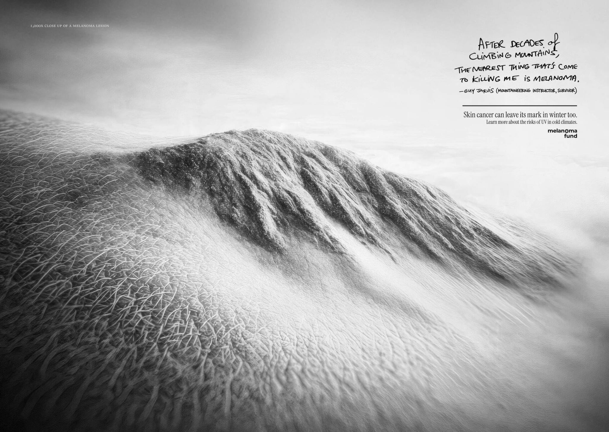 Derrière cette campagne conçue par l’agence Klick Health à Londres, une idée simple mais redoutable : faire ressembler des mélanomes à des paysages de haute montagne. À première vue, les visuels évoquent des sommets enneigés, des reliefs escarpés et des panoramas familiers pour les amateurs d’activités outdoor. Mais en s’approchant, la réalité apparaît. Ces images sont en fait des gros plans de véritables lésions cutanées.