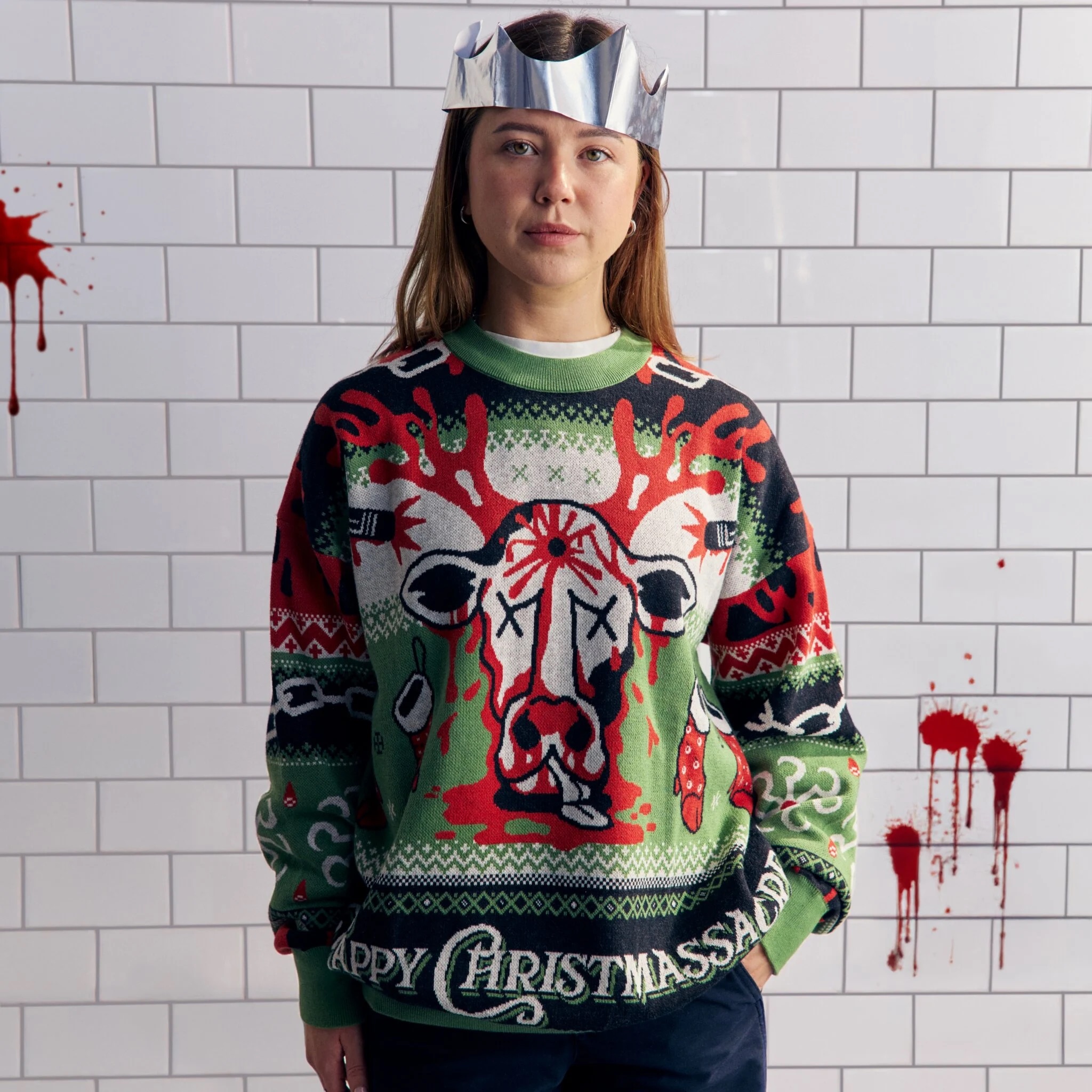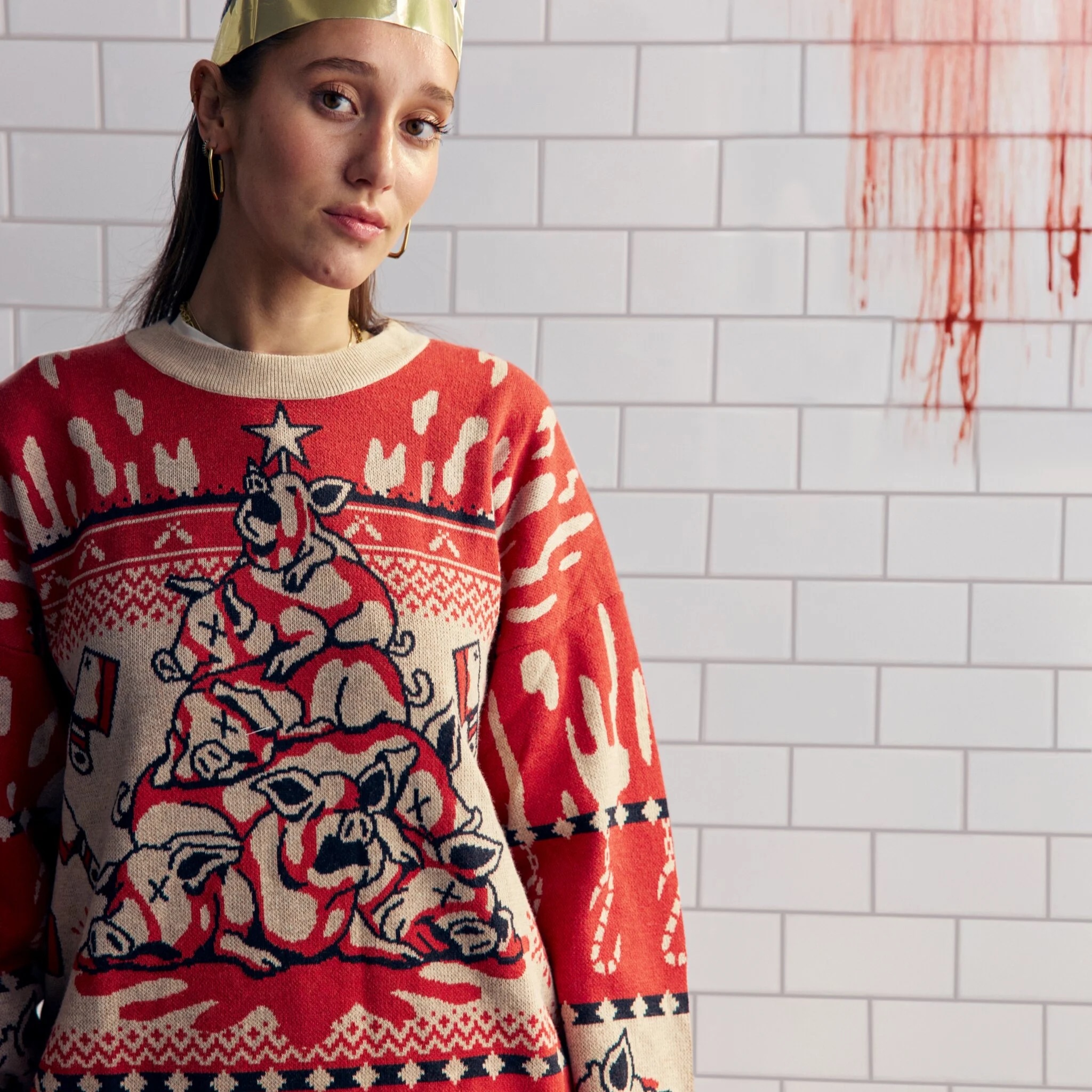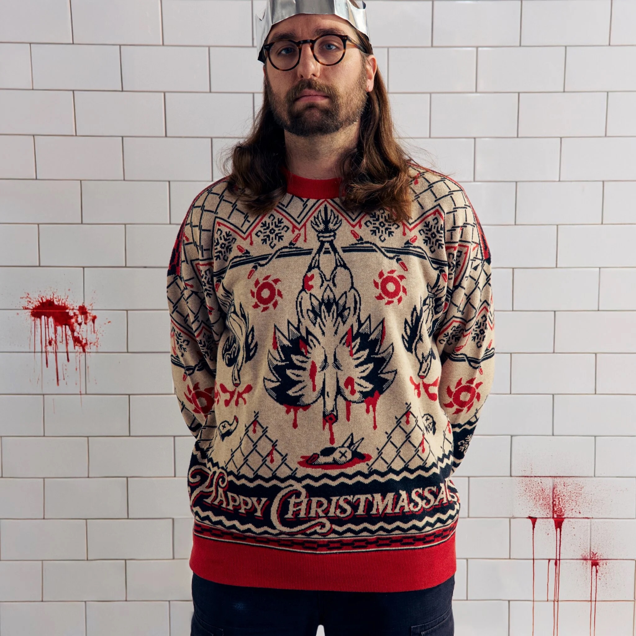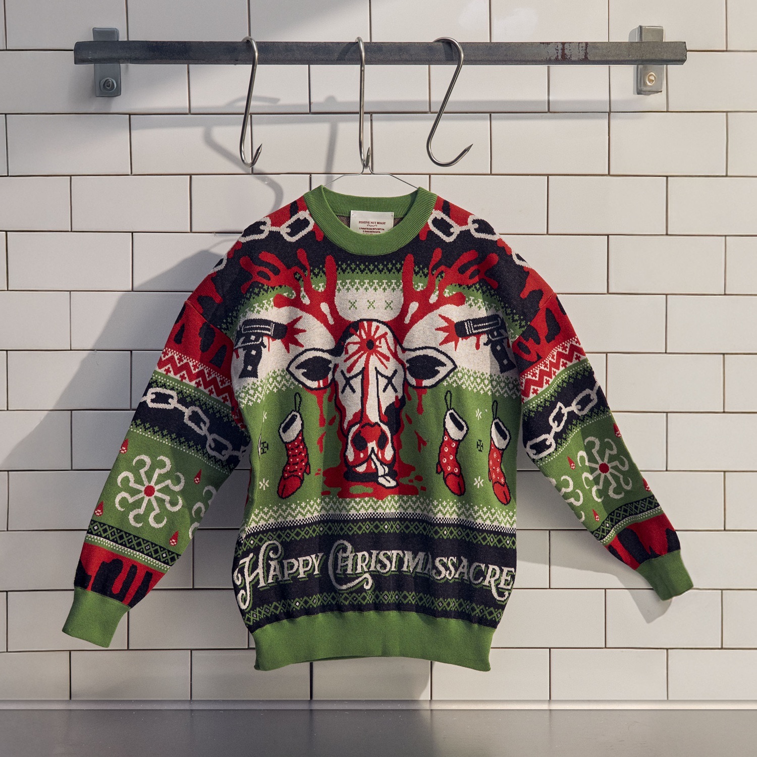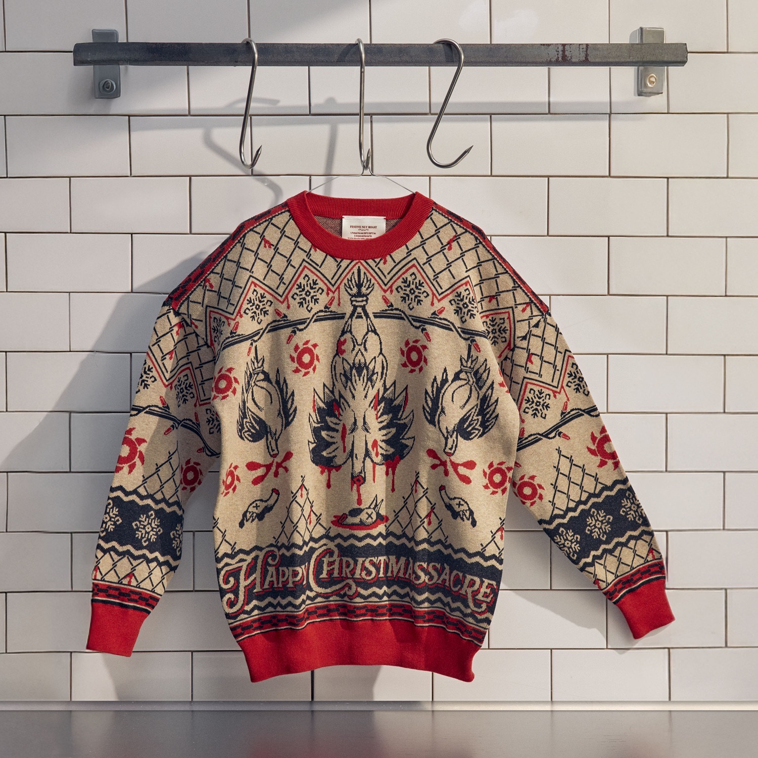 Depuis loin, on croirait des tricots nordiques comme on en voit partout pendant les fêtes. Mais dès qu’on s’en approche, la magie s’efface : un taureau abattu, une dinde décapitée, une pyramide de porcs empilés comme un macabre sapin. Chaque scène est illustrée avec un sens du détail déroutant, imaginé avec l’artiste Rave Growl.