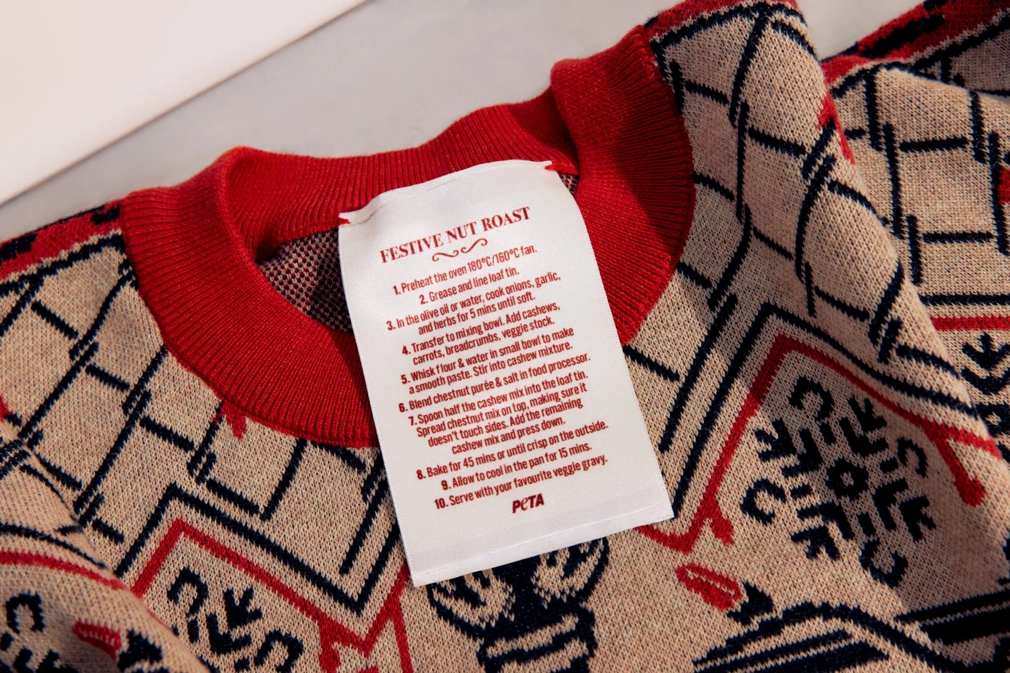 Le twist ne s’arrête pas aux motifs. À l’intérieur de chaque pull, une petite étiquette cousue renferme une recette de rôti de Noël… végétal. Un renversement audacieux qui remplace le traditionnel menu par une invitation à la compassion. Tirés à seulement 50 exemplaires, ces pulls sont vendus au profit de l’organisme.