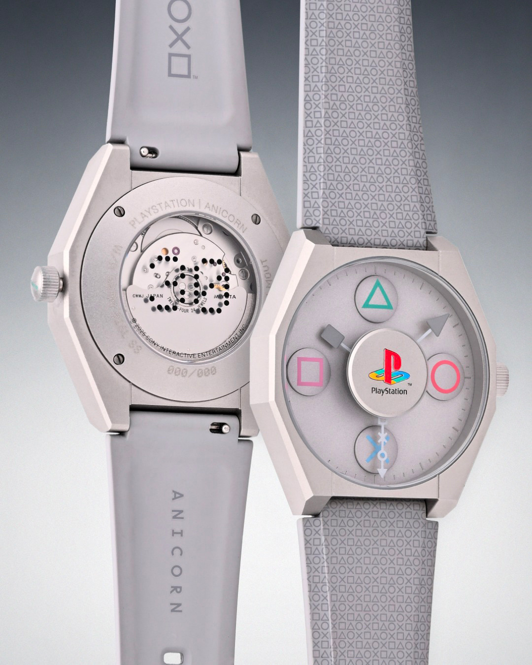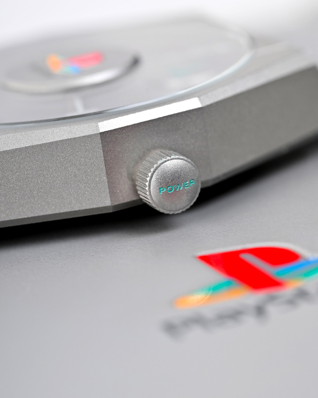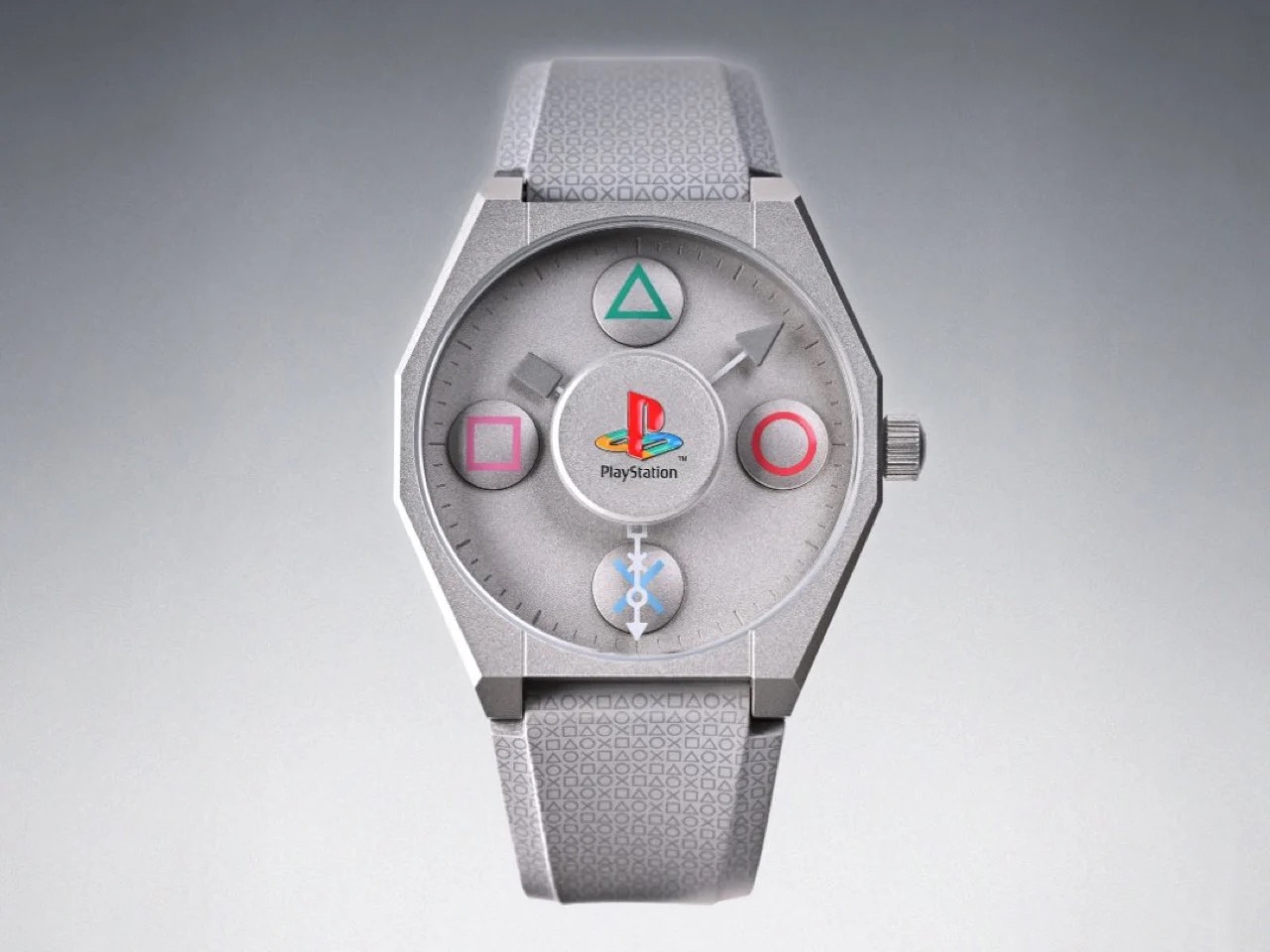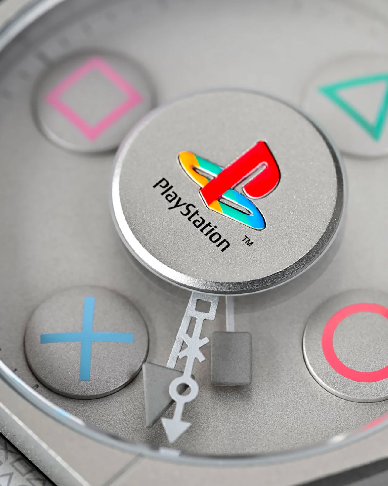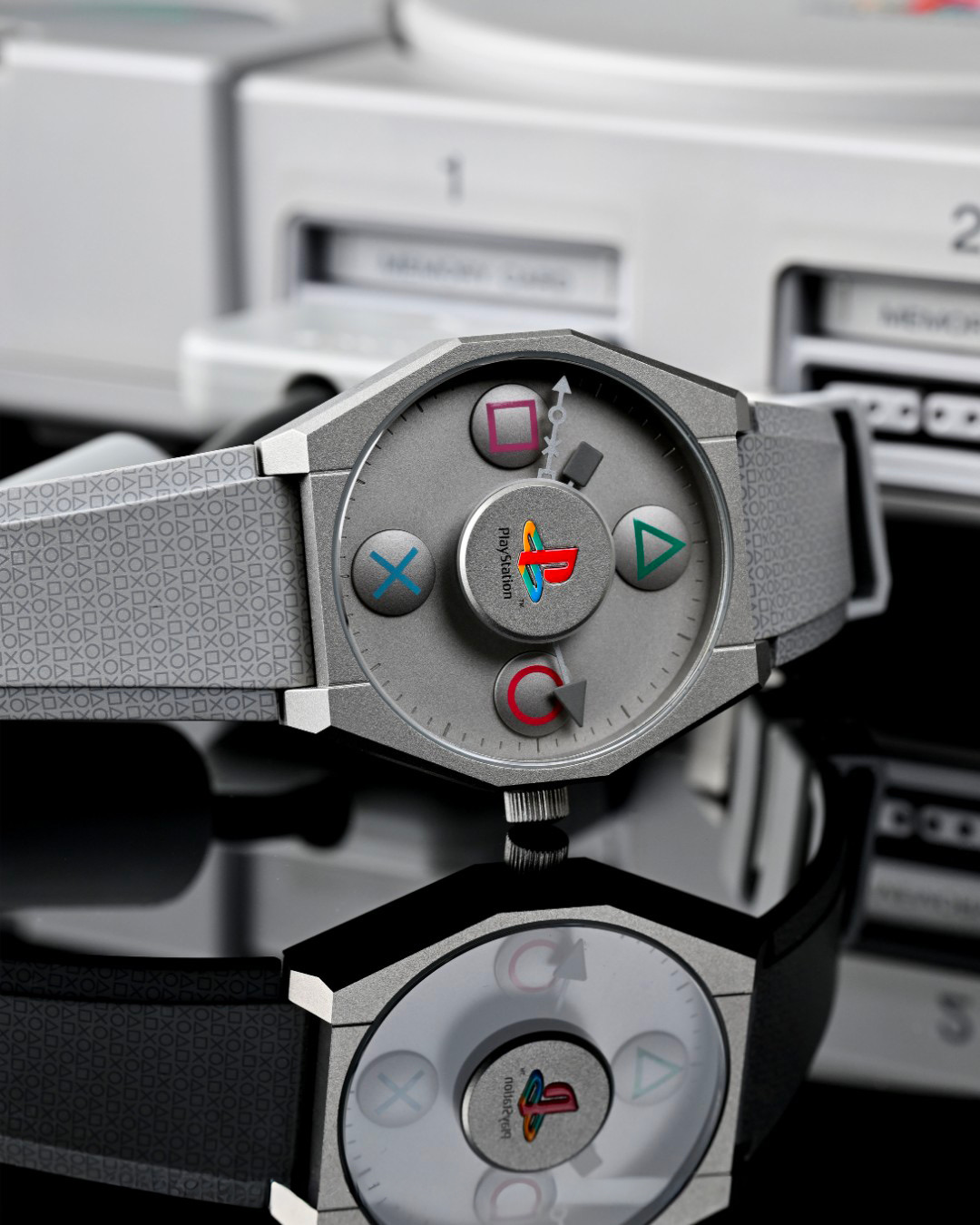 Dès le premier regard, la référence saute aux yeux. Le boîtier reprend les lignes anguleuses et presque industrielles de la PlayStation originale, avec ce gris mat immédiatement reconnaissable par toute une génération. Sur le cadran, les emblématiques icônes de la manette prennent la place des index traditionnels, appliqués en relief comme des boutons prêts à être pressés.