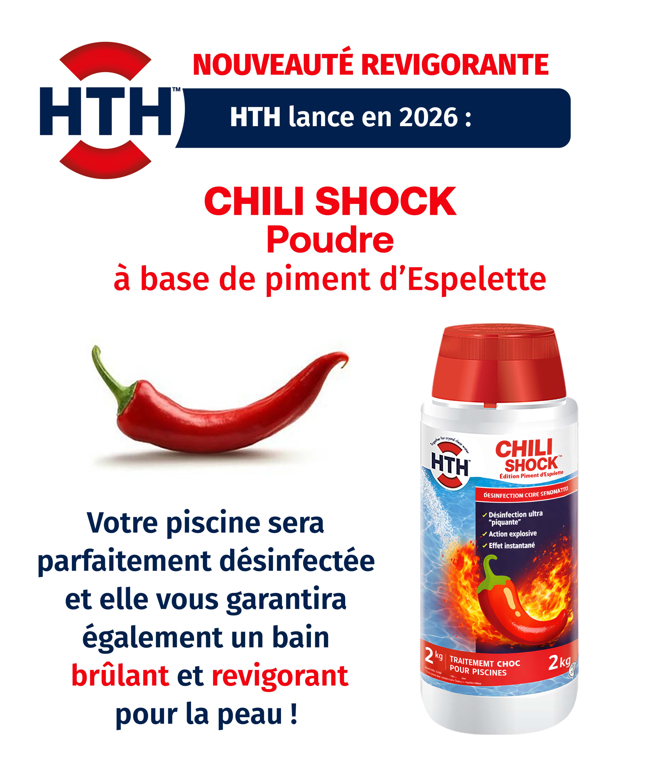 HTH détourne ses codes produits avec “Chili Shock”, une poudre de traitement pour piscine à base de piment d’Espelette. Présentée comme une solution à la fois désinfectante et “revigorante”, elle promet un bain pour le moins… piquant. Une idée complètement décalée pour une marque pourtant experte du traitement de l’eau, qui joue ici avec humour sur ses promesses d’efficacité.