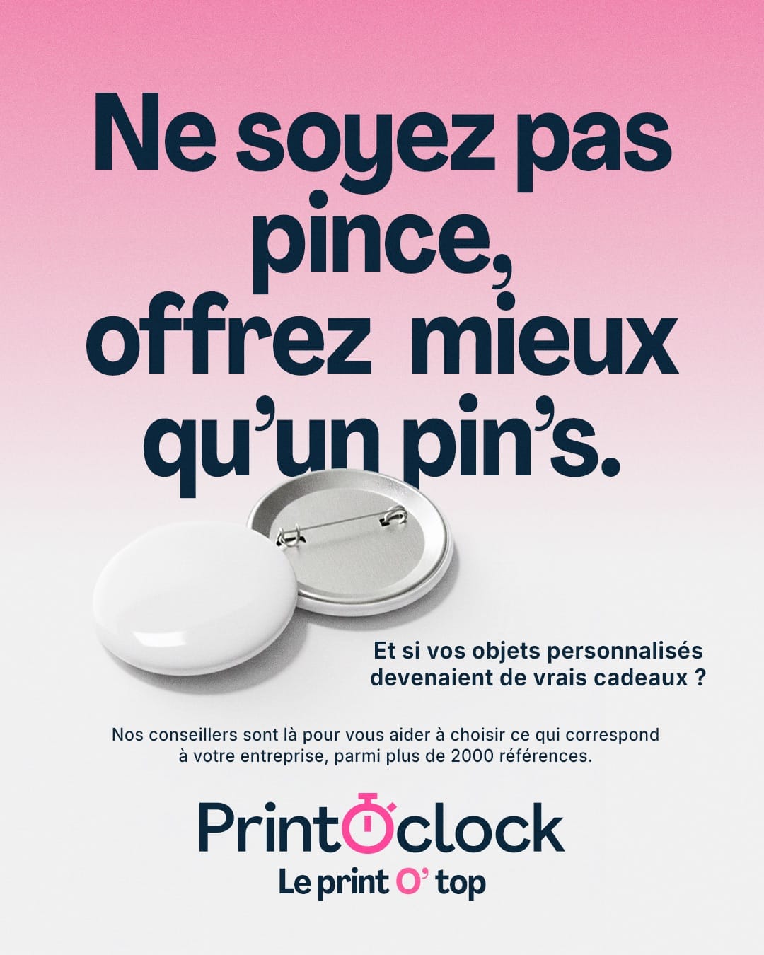 Stylos oubliés au fond d’un tiroir, pin’s jamais portés, objets publicitaires distribués par réflexe plus que par conviction… PrintOclock choisit de regarder cette réalité en face avec une campagne print qui assume un ton frontal et ironique. L’objectif n’est pas seulement de promouvoir une gamme de produits, mais de poser une question simple et souvent évitée : pourquoi offrir des objets dont personne ne veut vraiment ?