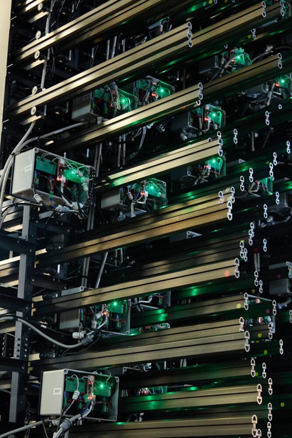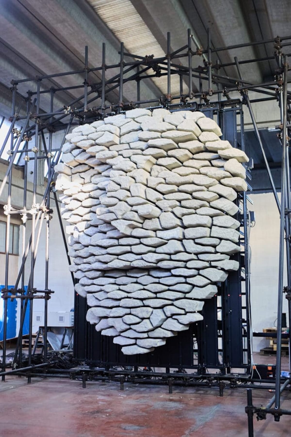 Imaginée par le bureau d’ingénierie turinois Leva, cette œuvre permanente de 12 m² se compose de 206 modules sur-mesure, chacun actionné par un moteur linéaire capable de 70 cm de débattement. Résultat : une façade de pierre qui se transforme sous les yeux des spectateurs pour esquisser un visage expressif, vivant et presque surnaturel, en parfaite synchronisation avec la narration du show.