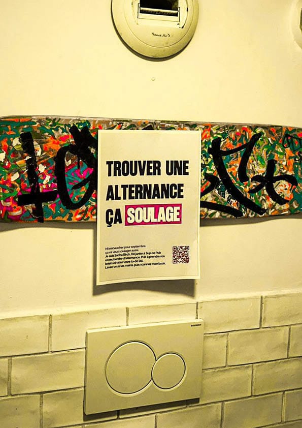 Étudiant en direction artistique à Sup de Pub, il a imaginé une campagne de guérilla marketing qui s’invite dans des lieux inattendus, là où les créatifs baissent la garde : les toilettes… et les bars d’agences.