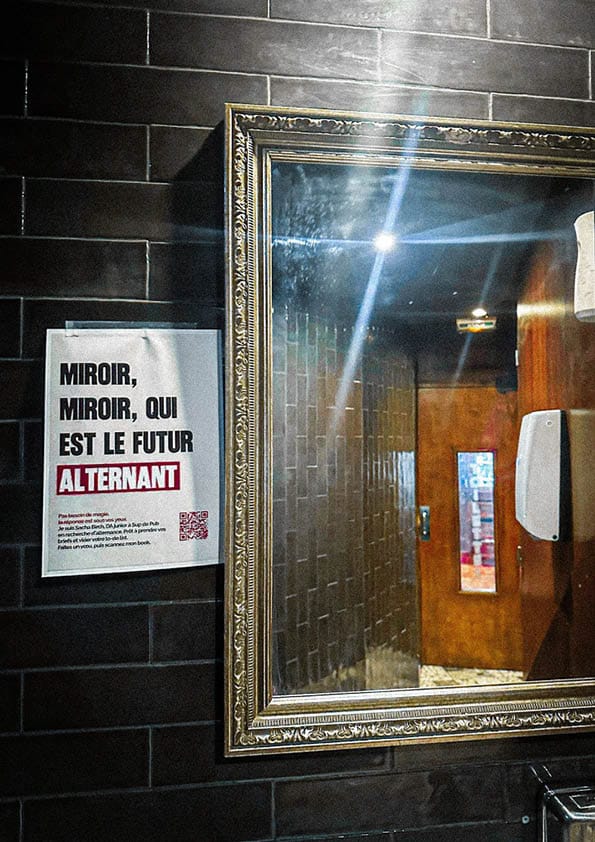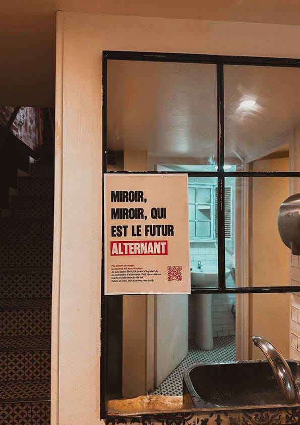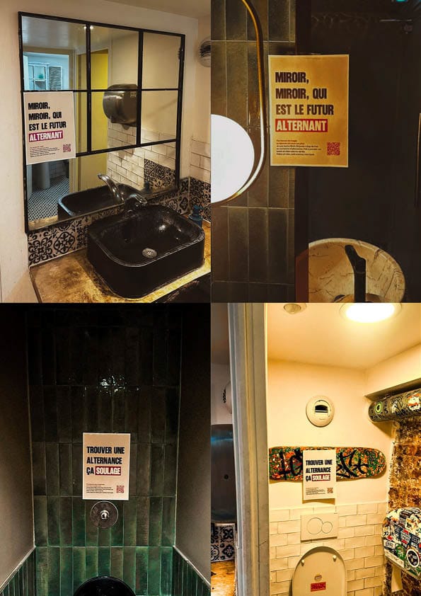 Face au miroir, une accroche interpelle directement le recruteur : « Miroir, miroir, qui est le futur alternant ? ». Côté urinoirs ou toilettes, le ton devient plus direct et complice : « Trouver une alternance ça soulage ».