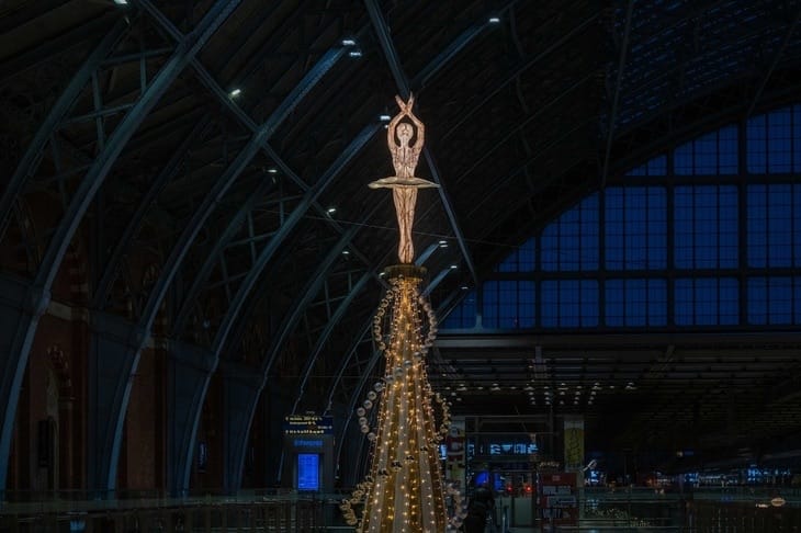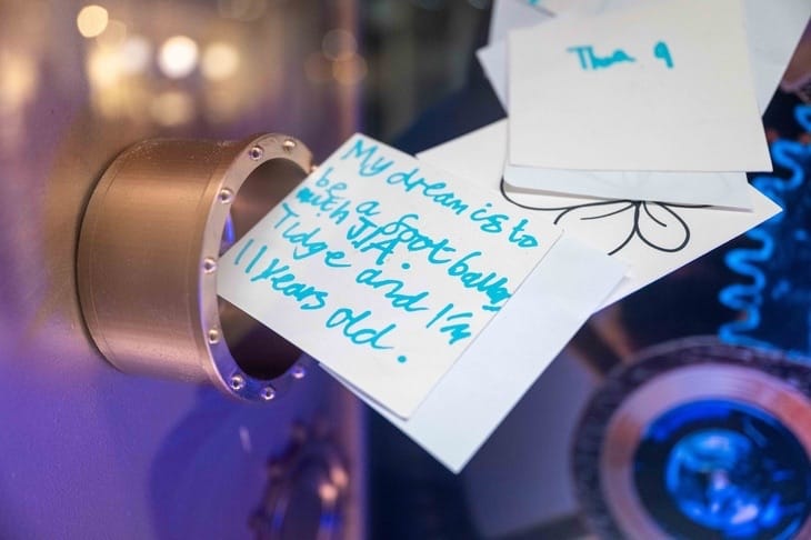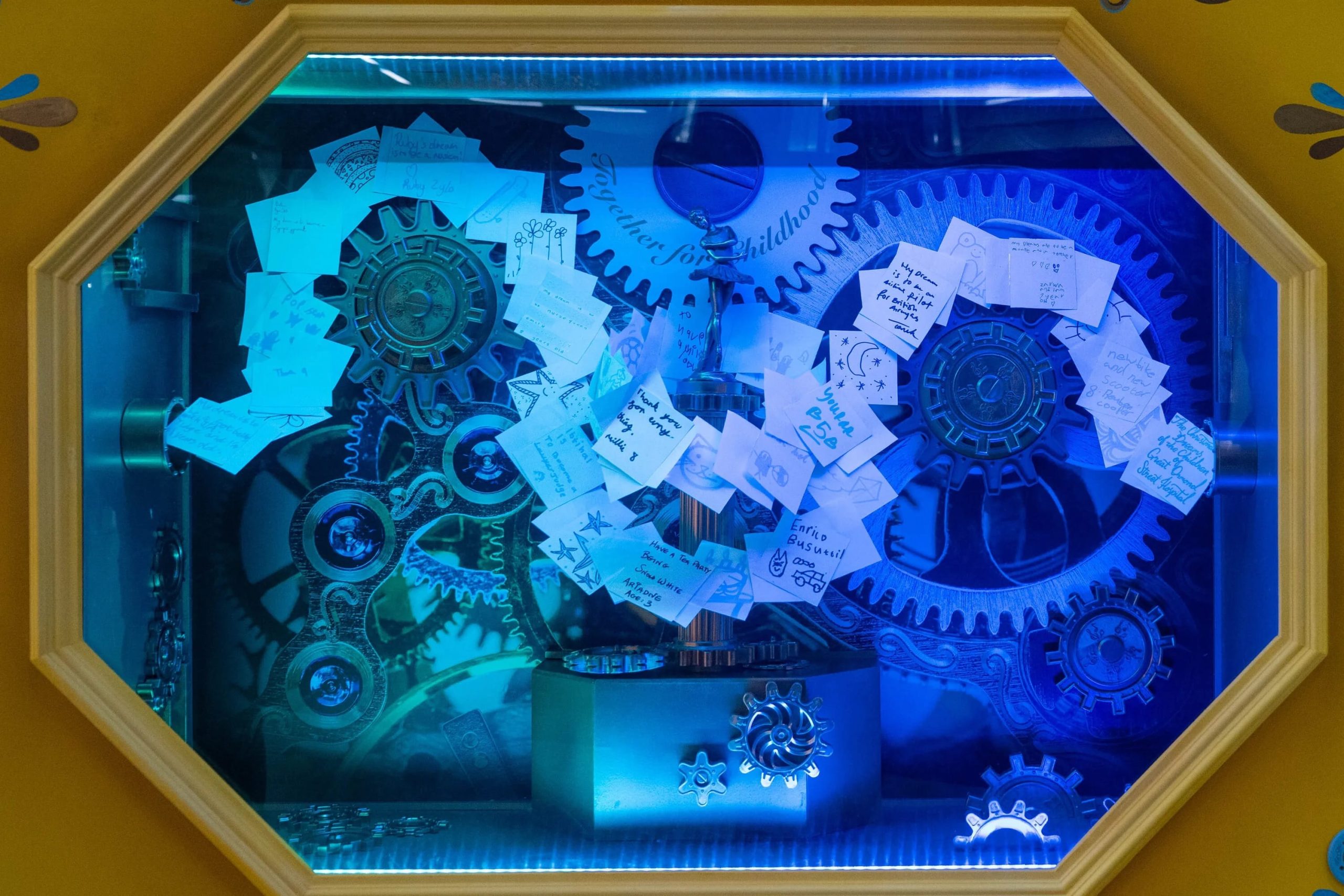 Baptisée Powered by Dreams, cette œuvre rend hommage à l’imagination des enfants du célèbre hôpital londonien. À travers ses engrenages dorés et ses vitraux lumineux, on découvre les rêves de 38 jeunes patients, dessinés et intégrés sous forme de décorations : devenir astronaute, pilote ou gymnaste olympique… Autant de vœux qui montent en spirale le long de l’arbre sous forme de boules peintes à la main, avant de s’illuminer au sommet sous les pas gracieux d’une ballerine.