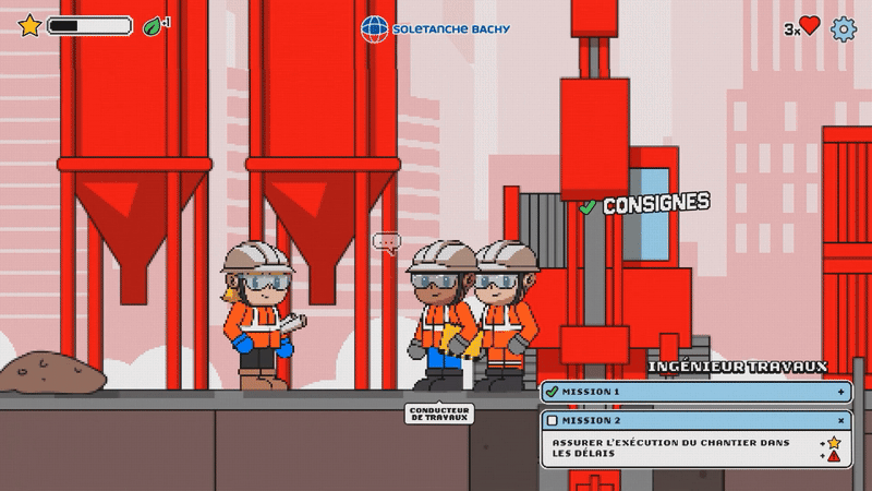 Chaque personnage évolue dans un décor pixélisé, façon jeu vidéo, et accomplit les missions quotidiennes de son métier. On y voit les interactions avec les autres équipes, les grandes étapes d’un projet… et même des points bonus attribués pour toutes les actions liées à la sécurité ou à l’environnement, deux enjeux essentiels pour l’entreprise.