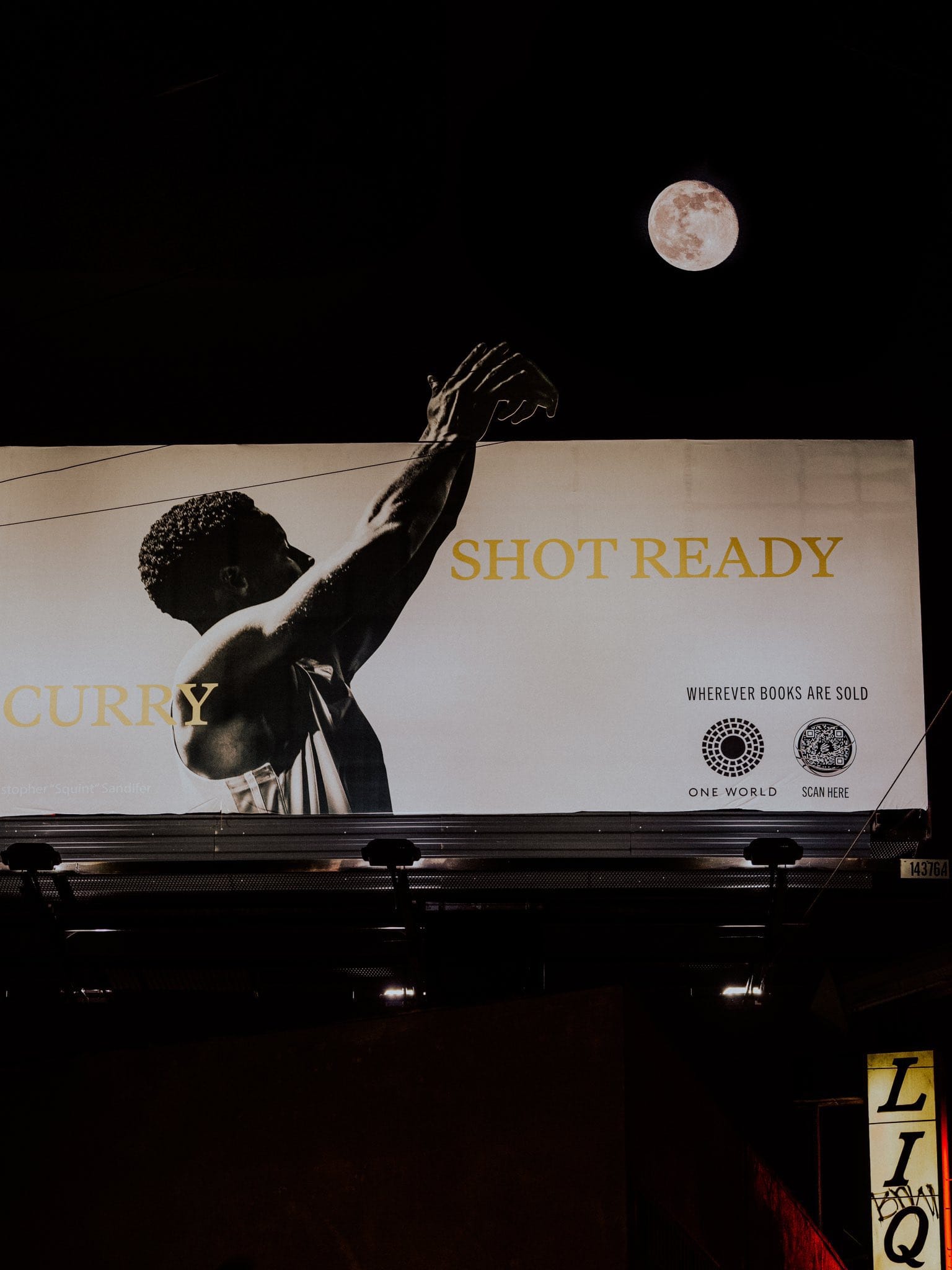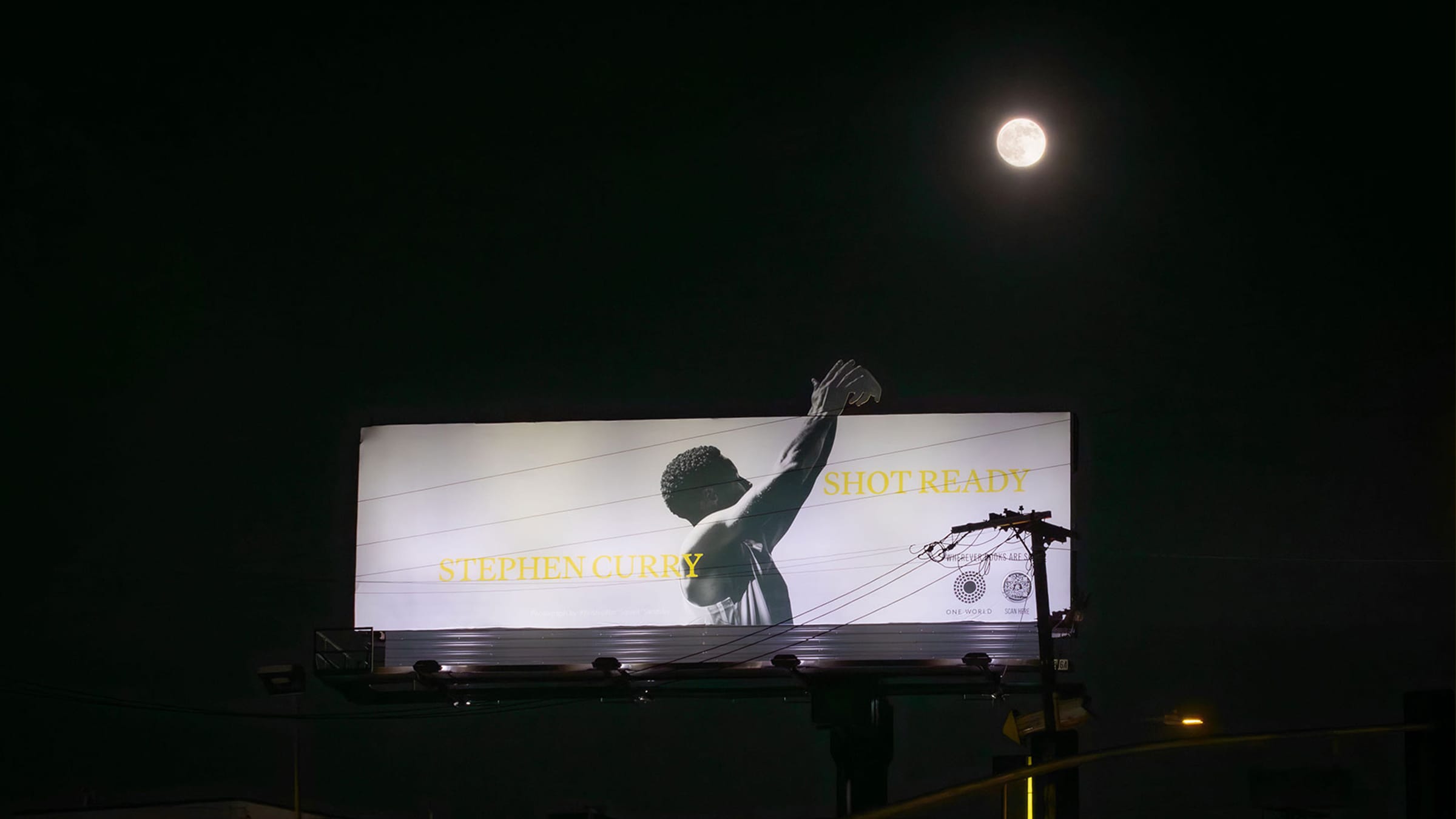 - Pour la sortie de son livre Shot Ready, Stephen Curry transforme un panneau publicitaire en œuvre céleste, alignée avec la pleine lune pour simuler un tir parfait.