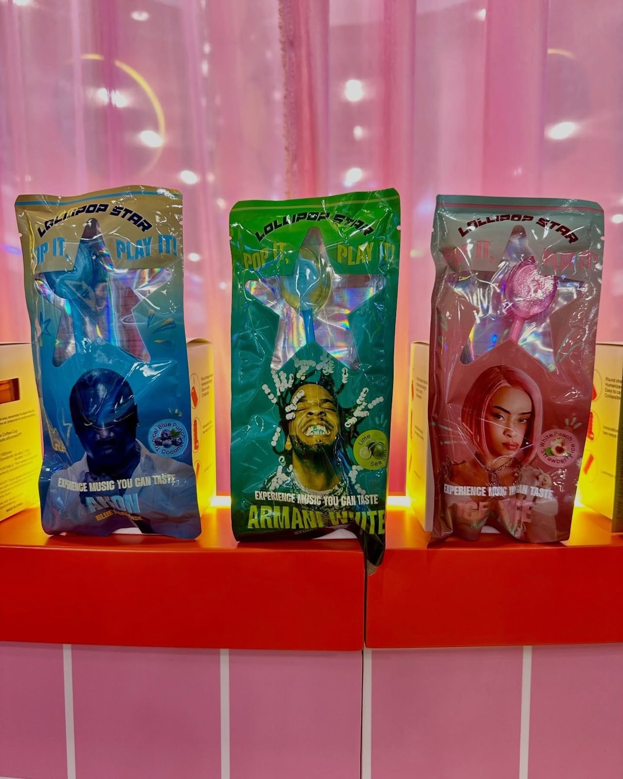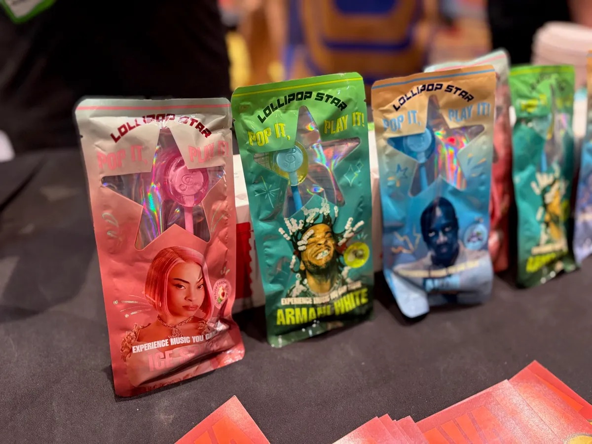 Là où Lollipop Star cherche aussi à se démarquer, c’est dans sa dimension collector : chaque saveur est associée à un artiste et à une sélection de morceaux accessibles uniquement via la sucette. Parmi les noms annoncés : Ice Spice, Akon et Armani White, chacun lié à une combinaison de goûts (pêche, fraise, citron vert…).