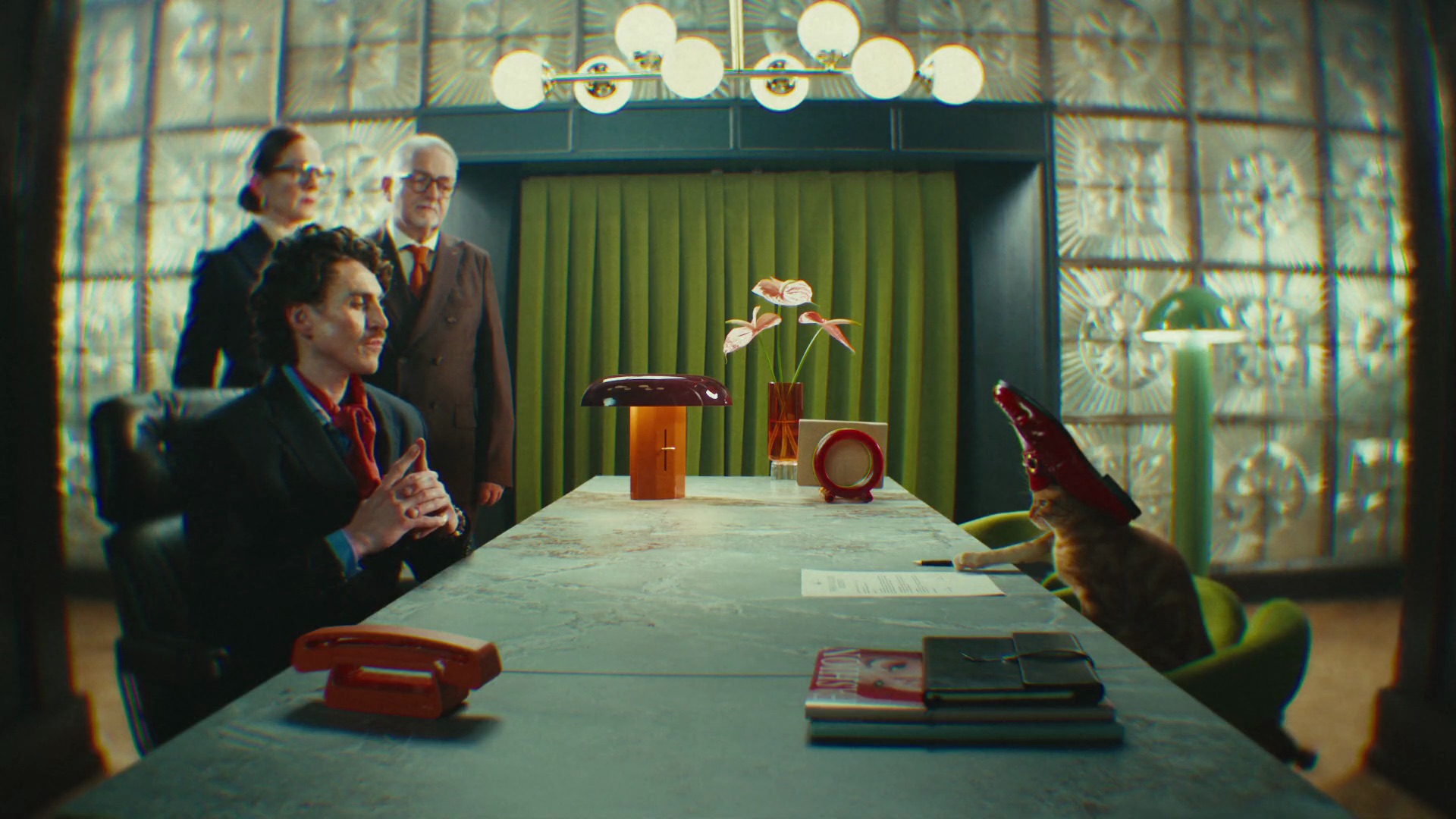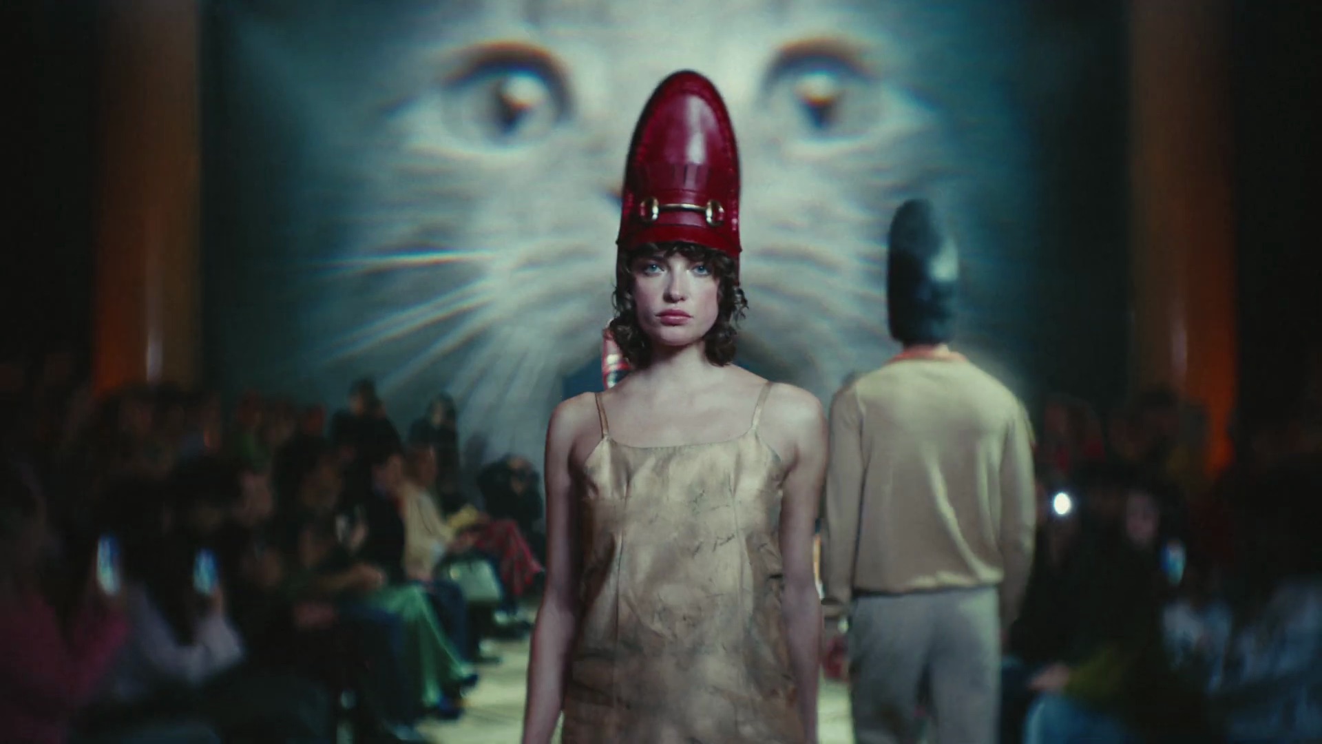 La viralité déclenche alors une escalade délicieusement absurde. Dans une salle de réunion ultra chic, des experts en tendances analysent le “loafer hat” avec le plus grand sérieux. Sur les podiums, des mannequins défilent avec des chaussures perchées sur la tête. Photographes et fashionistas s’arrachent le phénomène, érigeant le félin en nouvelle référence stylistique.