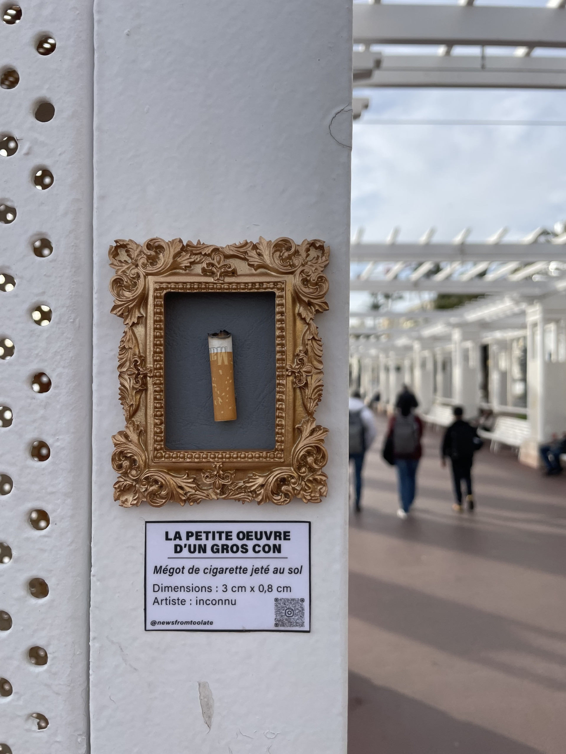 Le principe de “Cent filtres” repose sur la répétition. Cent pièces uniques, visibles dans les rues de Nice, qui portent toutes un message similaire et assument un ton volontairement cru. TOOLATE ne cherche pas la nuance esthétique, mais l’impact immédiat, celui qui interpelle et force à regarder.