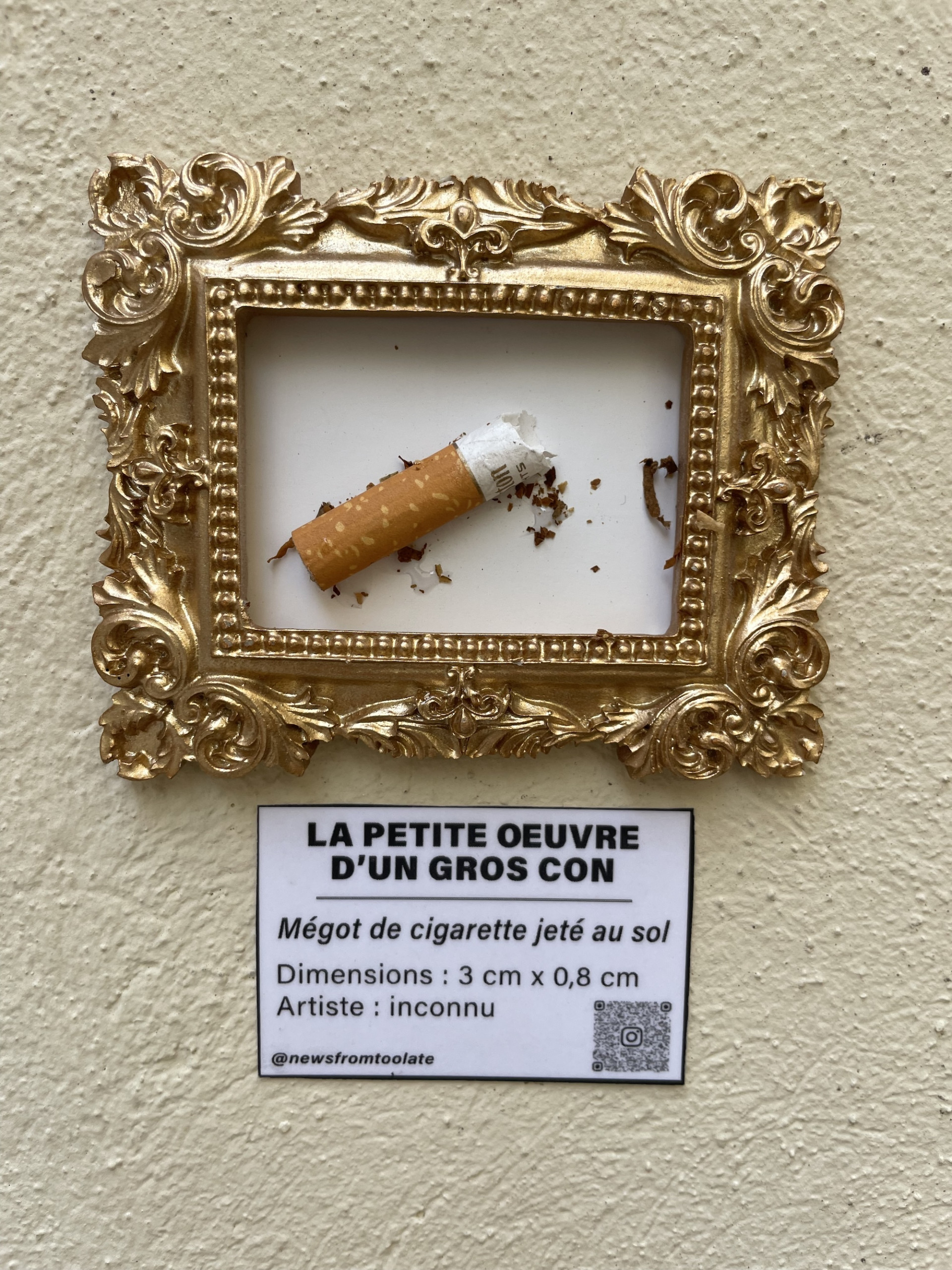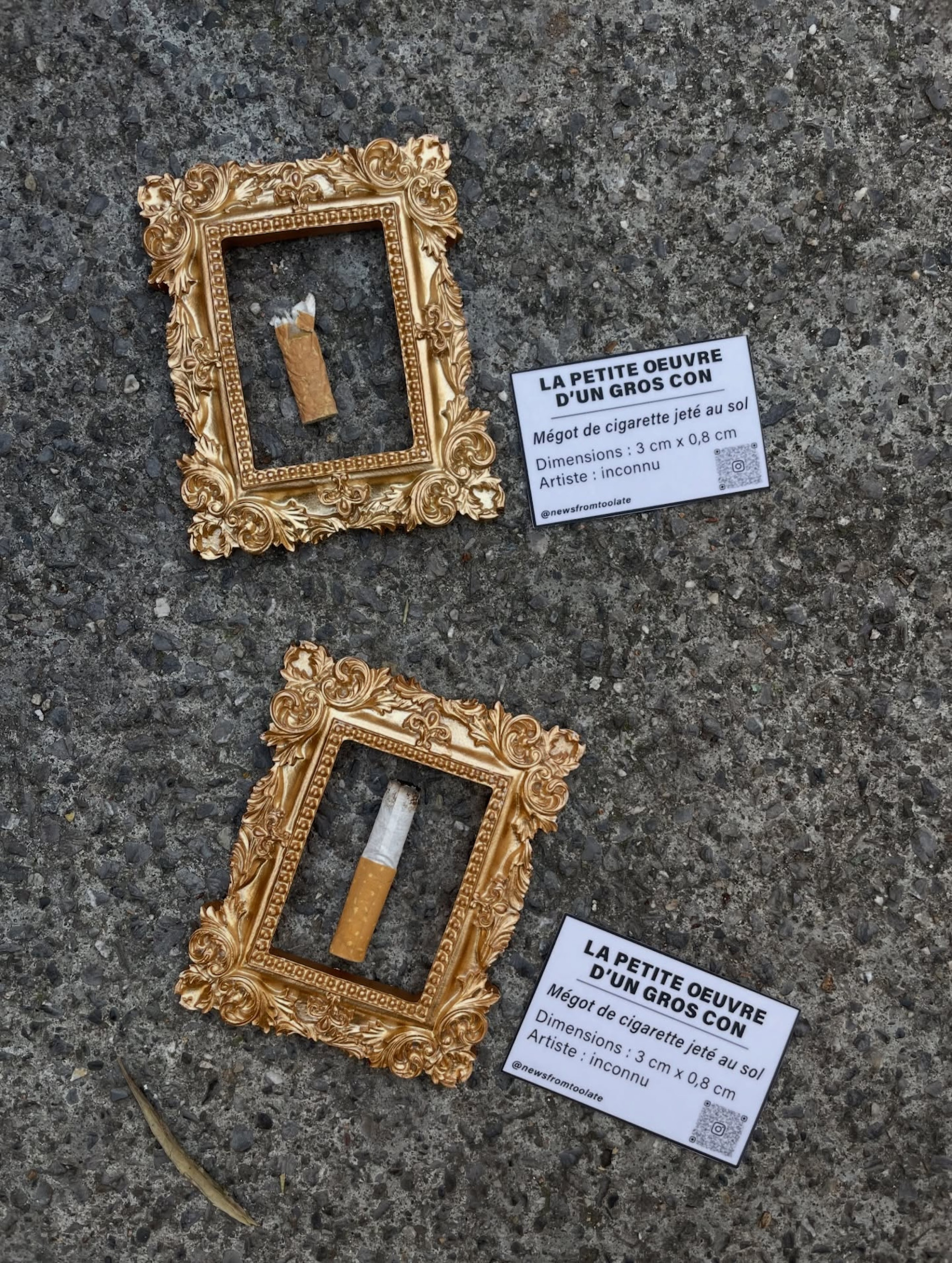 Pour TOOLATE, cette situation révèle un déséquilibre : la pollution liée aux mégots est largement documentée, mais sa gestion repose encore trop souvent sur la bonne volonté des bénévoles. À travers cette exposition, l’artiste rappelle que le sujet dépasse la simple question de propreté et pose celle des responsabilités, individuelles comme institutionnelles.