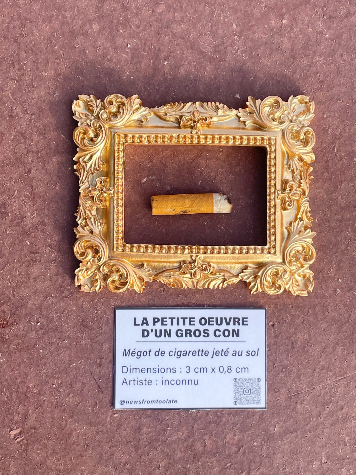 “Cent filtres” s’inscrit dans une démarche plus large, fidèle au parcours de TOOLATE. Depuis plusieurs années, l’artiste utilise l’art urbain comme un outil de dénonciation, en s’attaquant frontalement aux déchets, aux marques polluantes ou aux comportements jugés irresponsables. Nous vous invitons à aller découvrir l’ensemble de ses œuvres sur son compte Instagram.