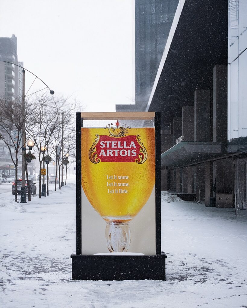 - À Toronto, Stella Artois installe un verre géant en affichage extérieur que la neige remplit naturellement, créant l’illusion d une mousse de bière XXL lors d’une tempête historique.